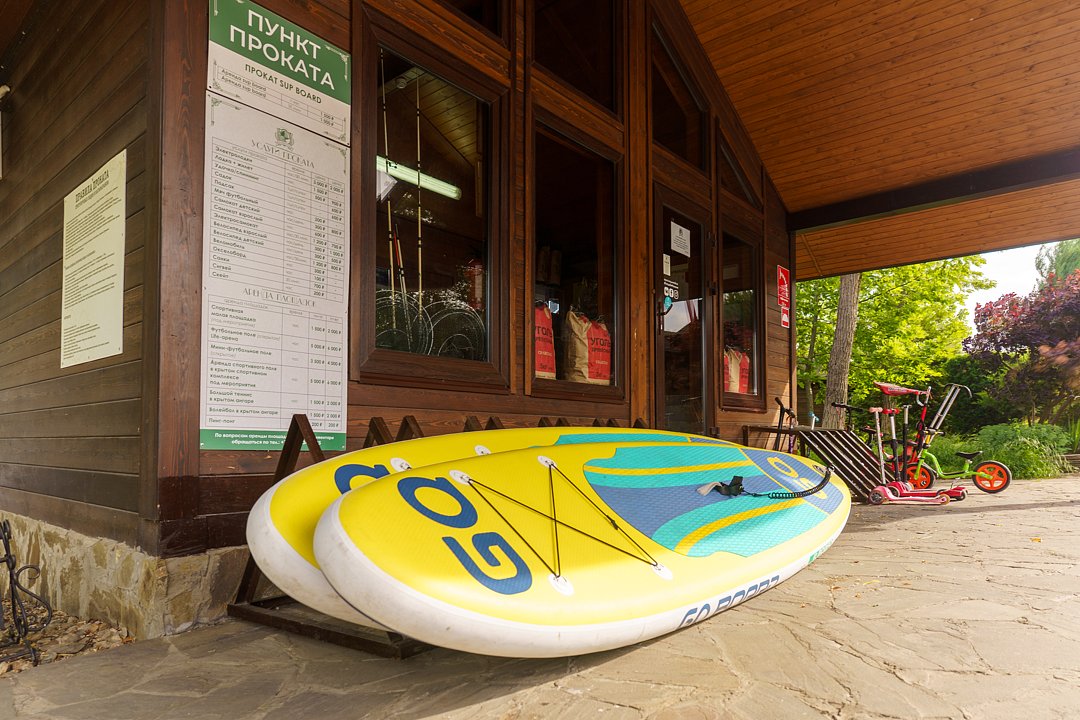 На территории — сорок шесть удобных мостиков и уединённых мест, прокат снастей (удочки, садки и прочее), а также зоны для отдыха: просторные беседки для больших компаний и компактные места на шесть человек с собственным причалом; для комфортного проживания предлагаются уютные домики рыбака с мангалами и частными причалами.