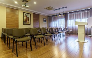 Малый конференц‑зал, площадь которого составляет пятьдесят квадратных метров, может вместить до сорока участников. В зале установлены LED‑экраны, профессиональное световое и звуковое оборудование, а также трибуна для выступлений — все необходимое для проведения деловых встреч и презентаций.