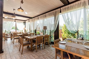 Для защиты от погодных условий и яркого солнца по периметру установлены пластиковые рулонные шторы. Наличие современных ТВ-плазм позволяет организовать презентации и развлекательные программы, обеспечивая комфортное проведение мероприятий в любую погоду. Гости могут наслаждаться живописными видами и приятной обстановкой, независимо от капризов природы.