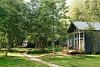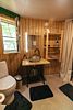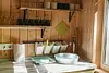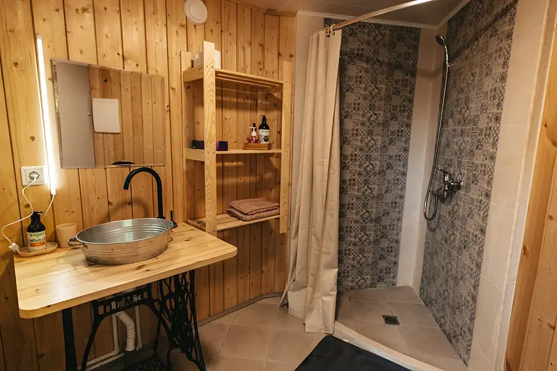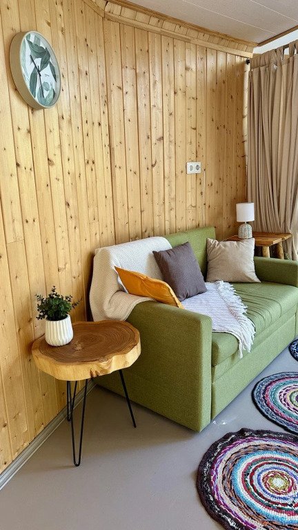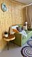 В домике на первом этаже: мини-кухня (холодильник, электроплитка, посуда для приготовления и сервировки, электрочайник), ванная комната (душ, туалет, умывальник, горячая вода, полотенцесушитель, гигиенические принадлежности), спальная комната с 2 односпальными кроватями (возможно трансформировать в большую двуспальную кровать), обеденный стол.