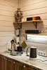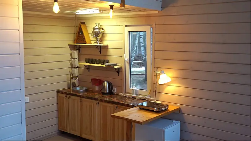 В домике на первом этаже: мини-кухня (холодильник, электроплитка, посуда для приготовления и сервировки, электрочайник); 1,5-спальный диван; барная стойка с панорамным видом на Волгу; ванная комната (туалет, душ, умывальник, горячая вода, полотенцесушитель, гигиенические принадлежности).