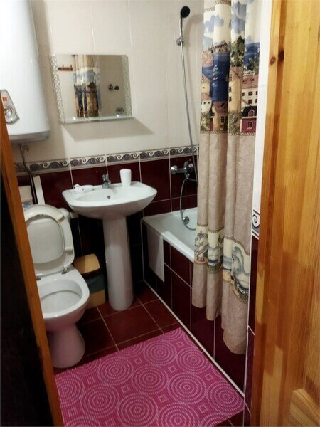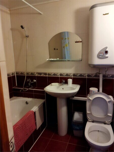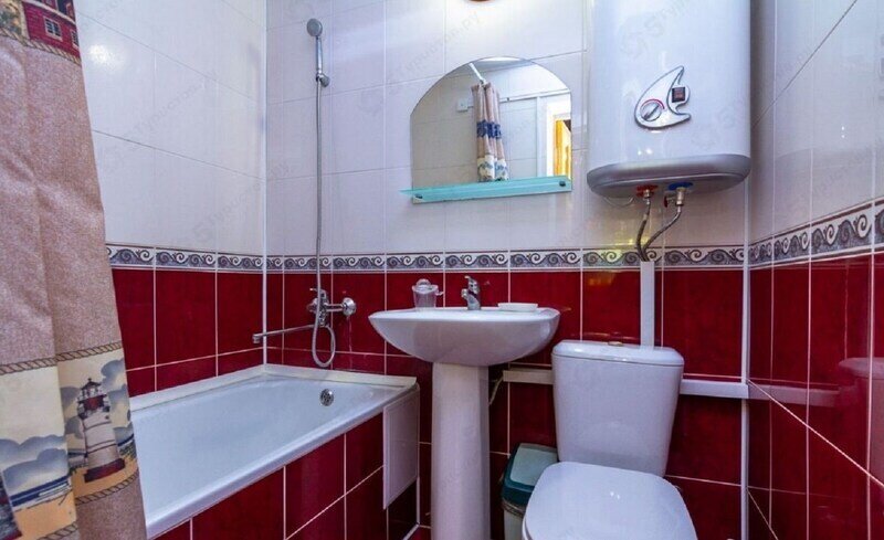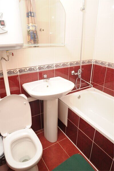 Санузел совмещенный: ванна, раковина, унитаз, зеркало, туалетные принадлежности.