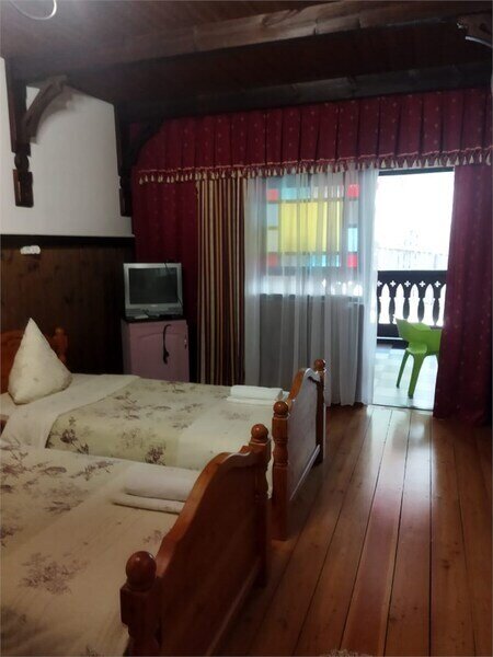 В номере двуспальная кровать и односпальная кровать, тумбочка, вешалка для одежды, чайный столик, стулья, телевизор, мини-холодильник, сплит-система.