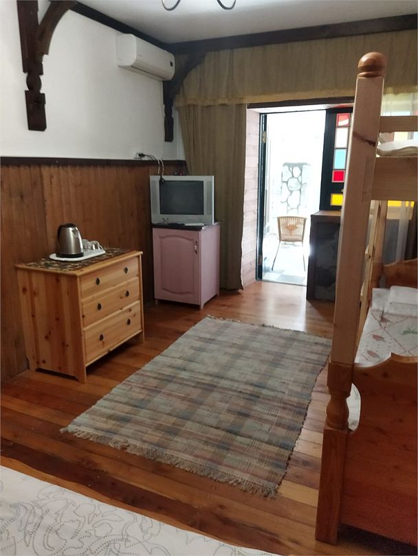 В номере двуспальная кровать и одна двухъярусная очень удобная кровать, тумбочки, вешалка для одежды, чайный столик, стулья, телевизор, мини-холодильник, сплит-система.