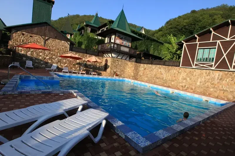 Гости могут насладиться большим бассейном, вкусным питанием и прудом с карпами.