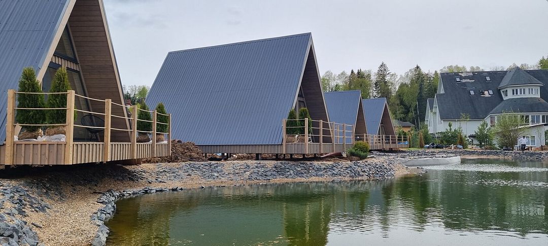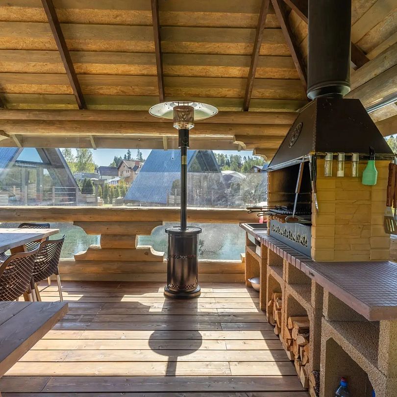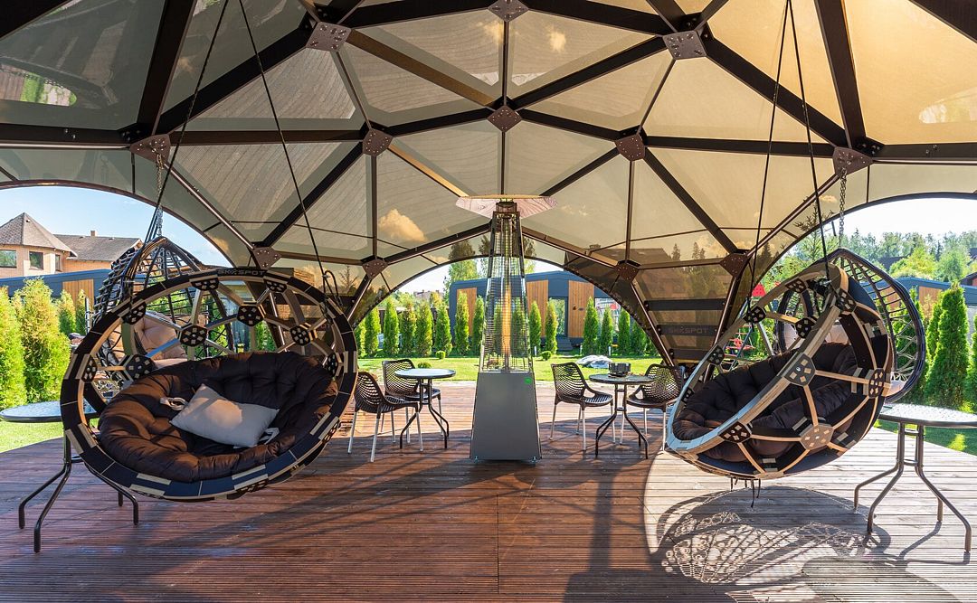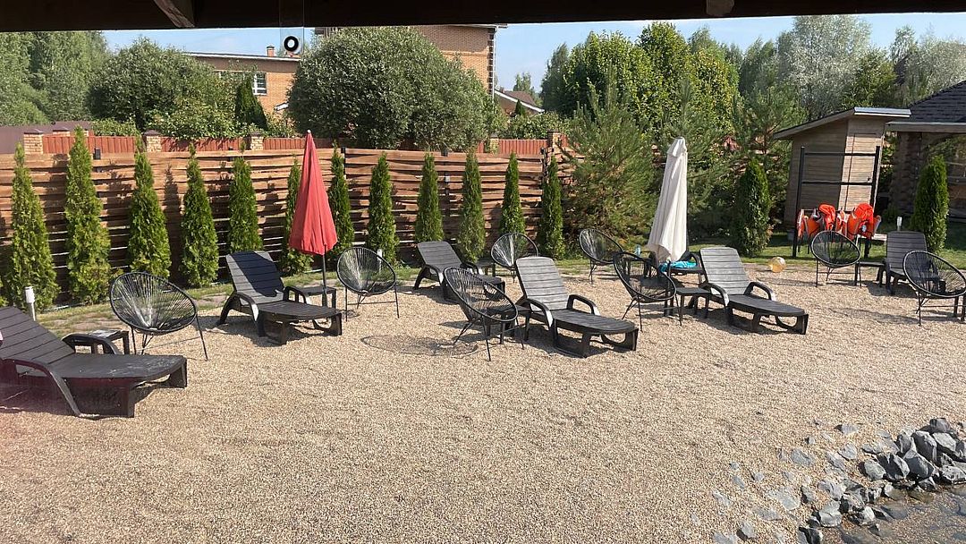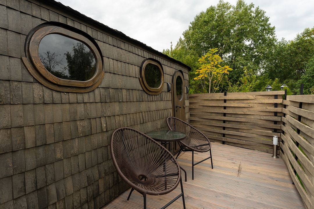 У каждого домика своё пространство с летней мебелью, диваном и зоной мангала и камина на улице. Домики специально расположены на некотором расстоянии друг от друга, чтобы обеспечить тишину и уединение гостям.