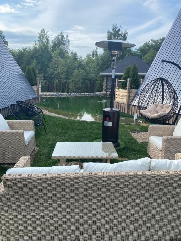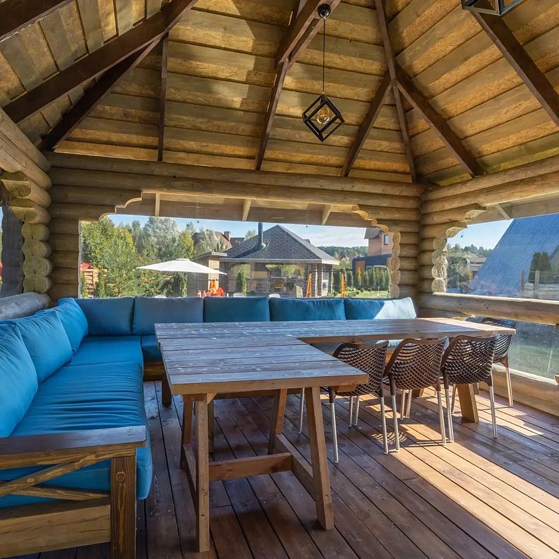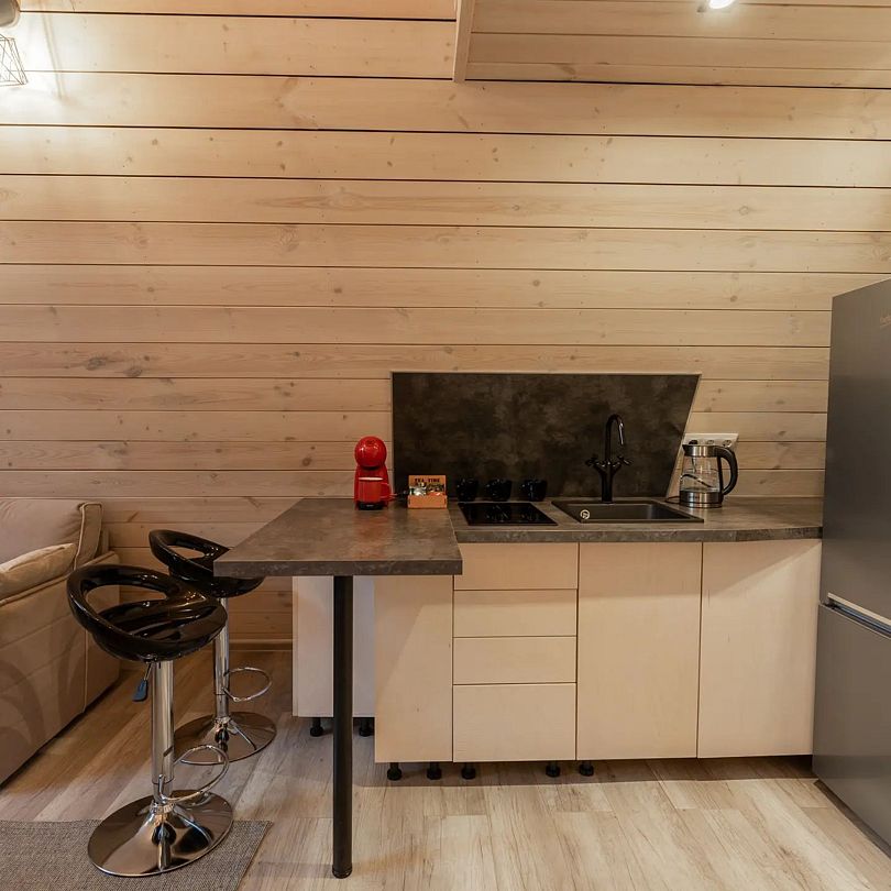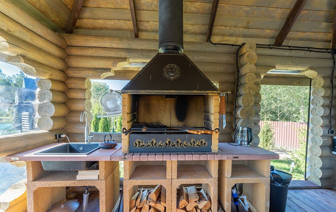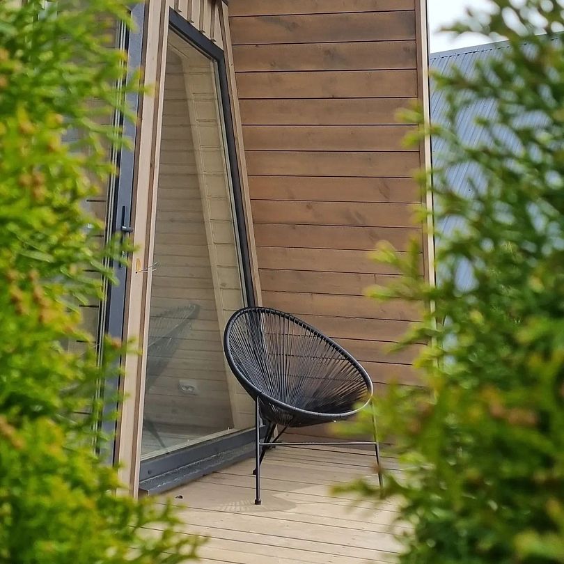 У каждого домика своё пространство с летней мебелью, диваном и зоной мангала и камина на улице. Домики специально расположены на некотором расстоянии друг от друга, чтобы обеспечить тишину и уединение гостям.