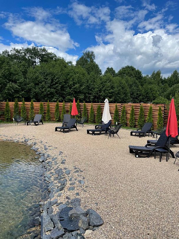 Тип пляжа: песчано-галечный, собственныйИнфраструктура: лежаки, зонтики, шезлонгиПозагорать на пляже и купаться в кристально чистом пруду.
