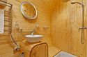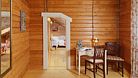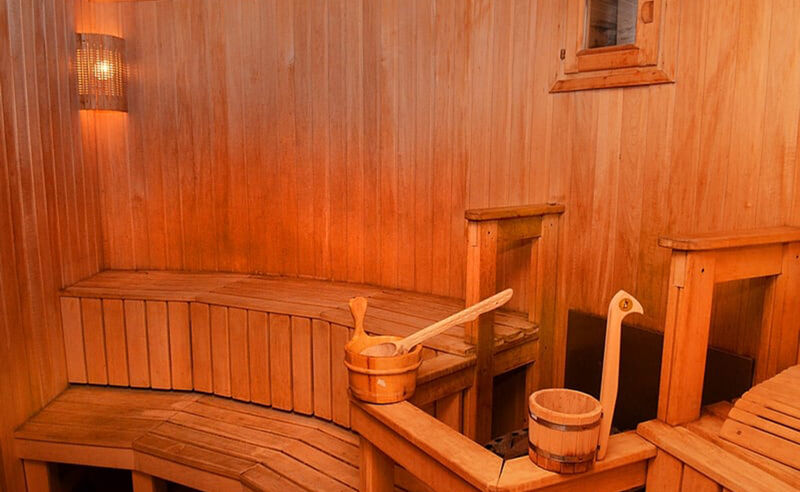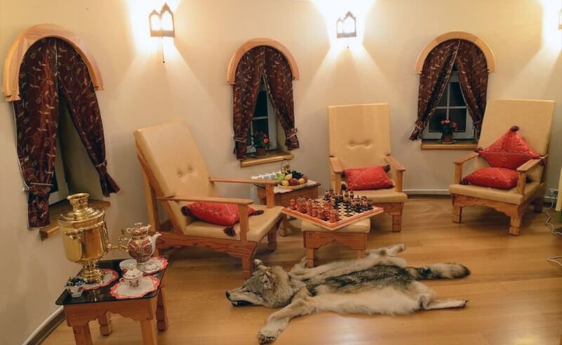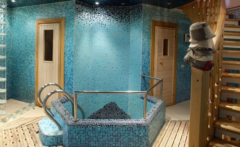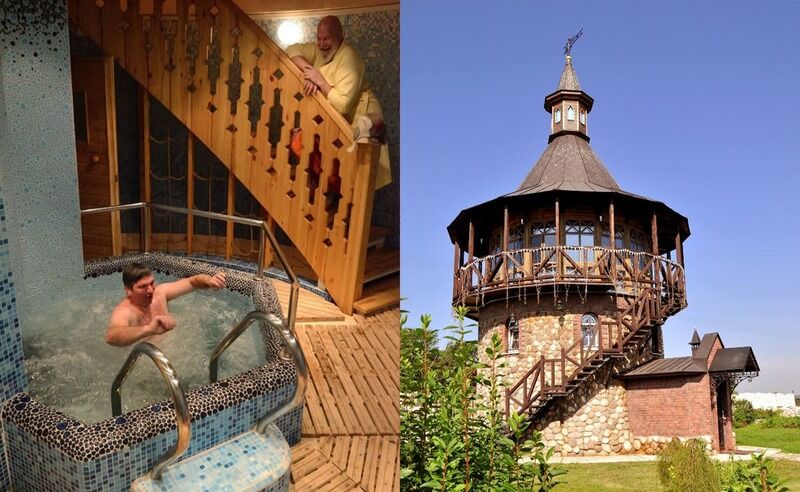 В цокольном этаже круглой каменной башни располагаются раздевалки. На первом — сауна вместимостью шесть человек, душевые и прохладная купель. На втором этаже комната отдыха. На третьем этаже стилизованной башни располагается небольшой зал с панорамными окнами, имеющий отдельный вход с улицы.