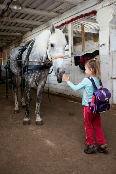 Предлагает обучение верховой и экипажной езде. Опытные инструкторы, манеж, два плаца, беговая дорожка.