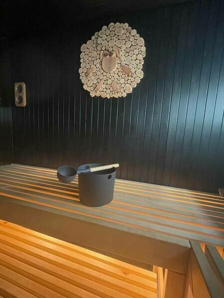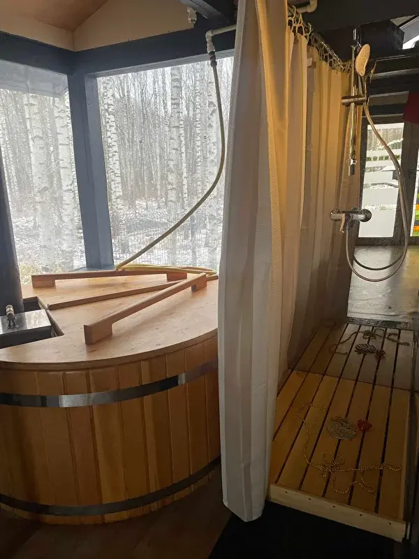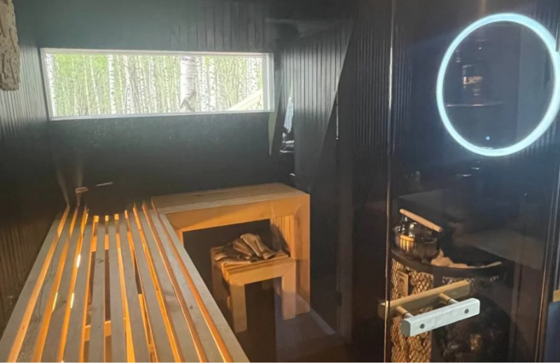 - Смоляная парная с мягким паром, вентиляцией и панорамным окном на лес, печь Harvia "заряжена" 120 кг камней (яшма, жадеит и кварц).