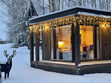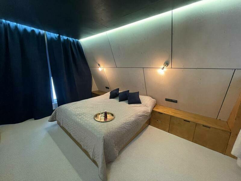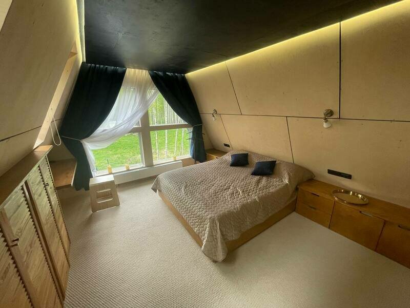 - Небольшая спальная комната на первом этаже и большая спальная на втором с письменным столиком. Также двуспальный матрац на третьем мансардном этаже. Кожаный диван в гостиной со вторым светом напротив камина с прекрасными видами через панорамные окна.
