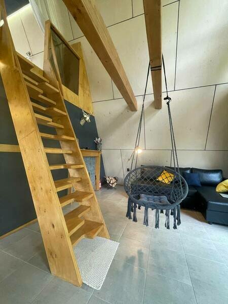 - Гостиная комната с камином, вторым светом и качелями-гамаком.