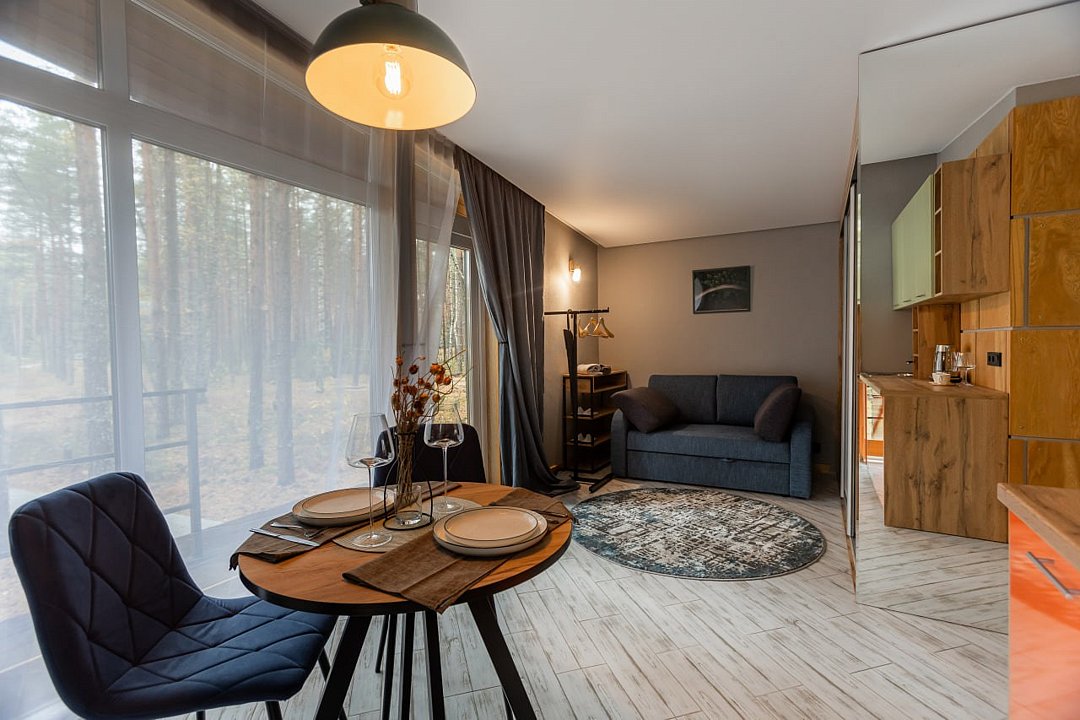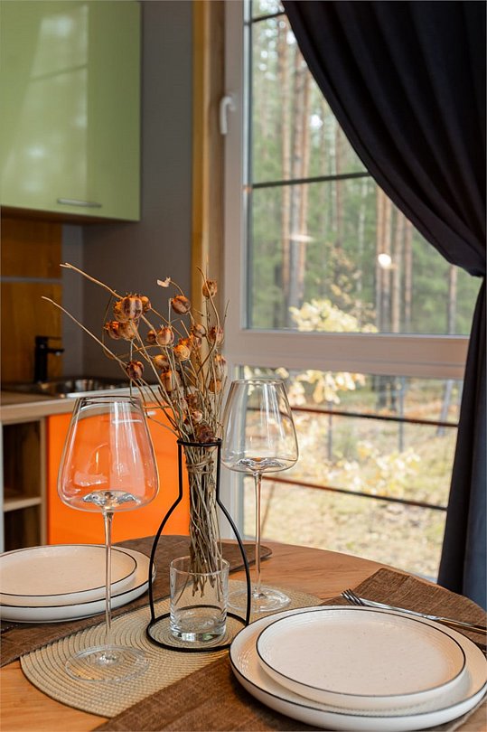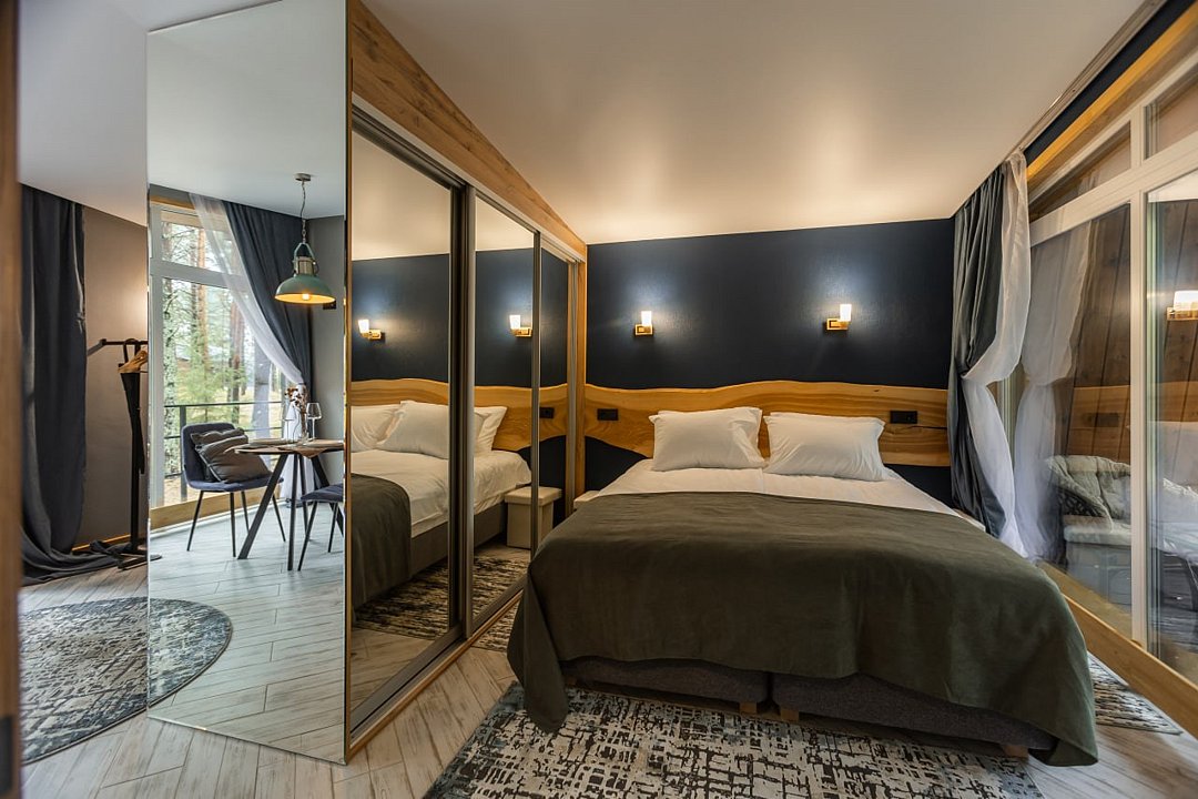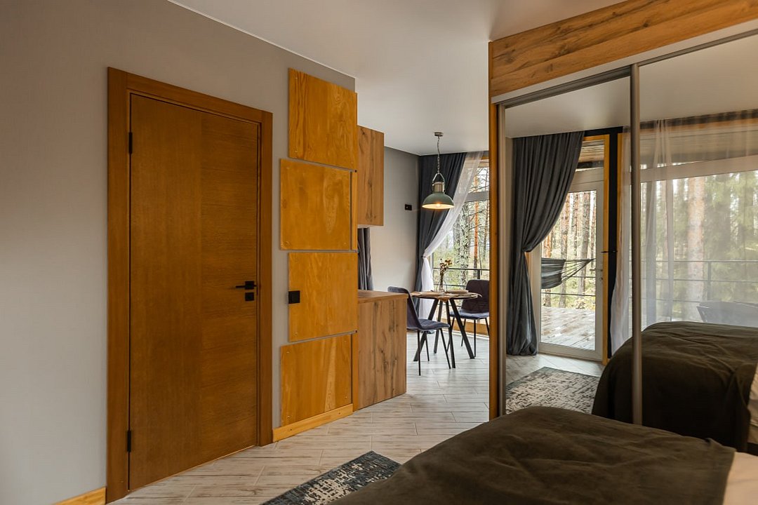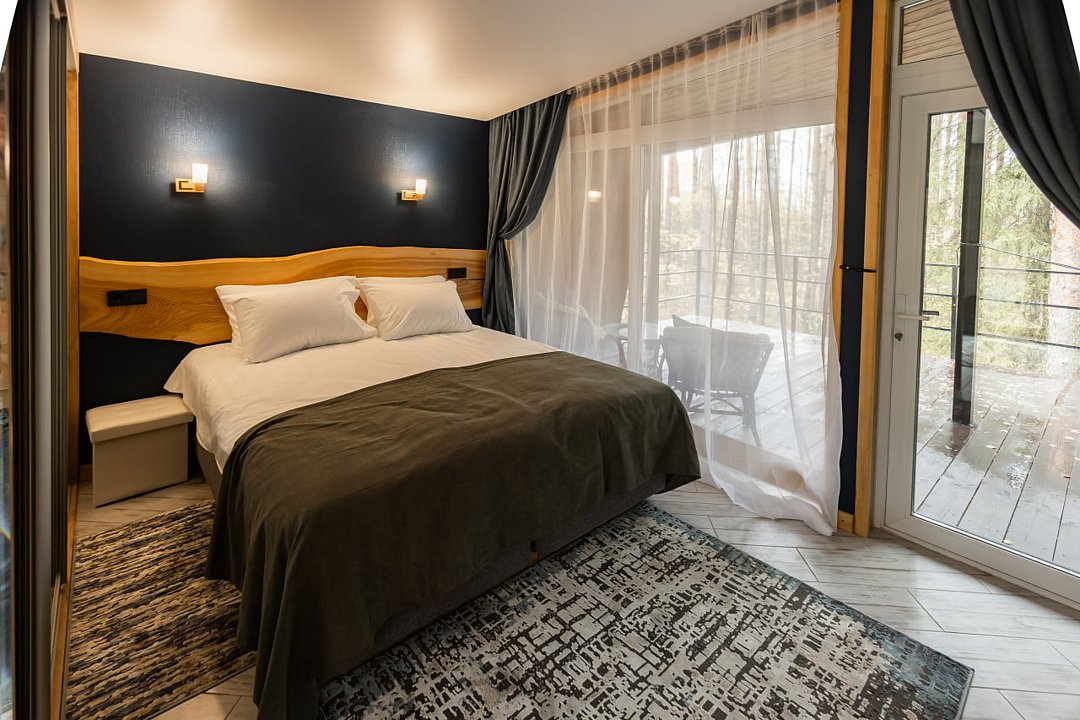 Гости размещаются в элегантных домиках-шале, выполненных в едином скандинавском стиле. Домик разделен большим зеркальным шкафом-купе на 2 зоны, спальня и гостиная с обеденной группой и раскладным диваном, что дает возможность организовать дополнительное место.