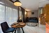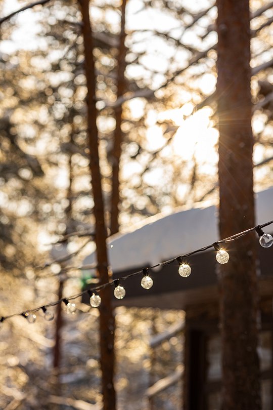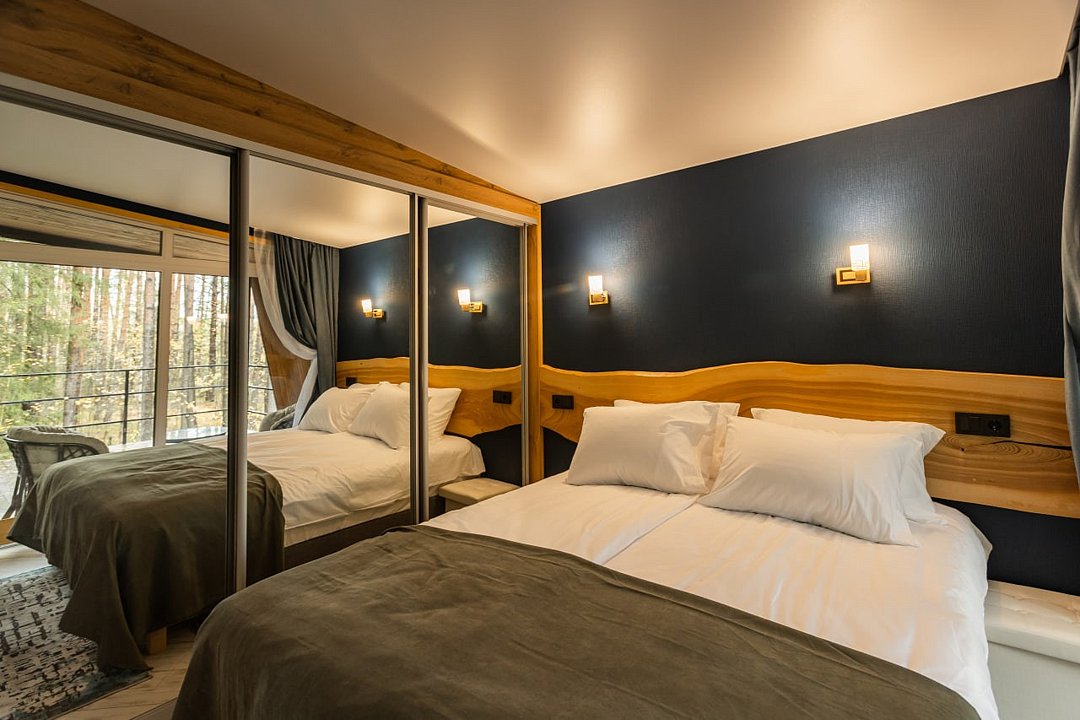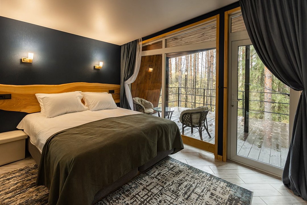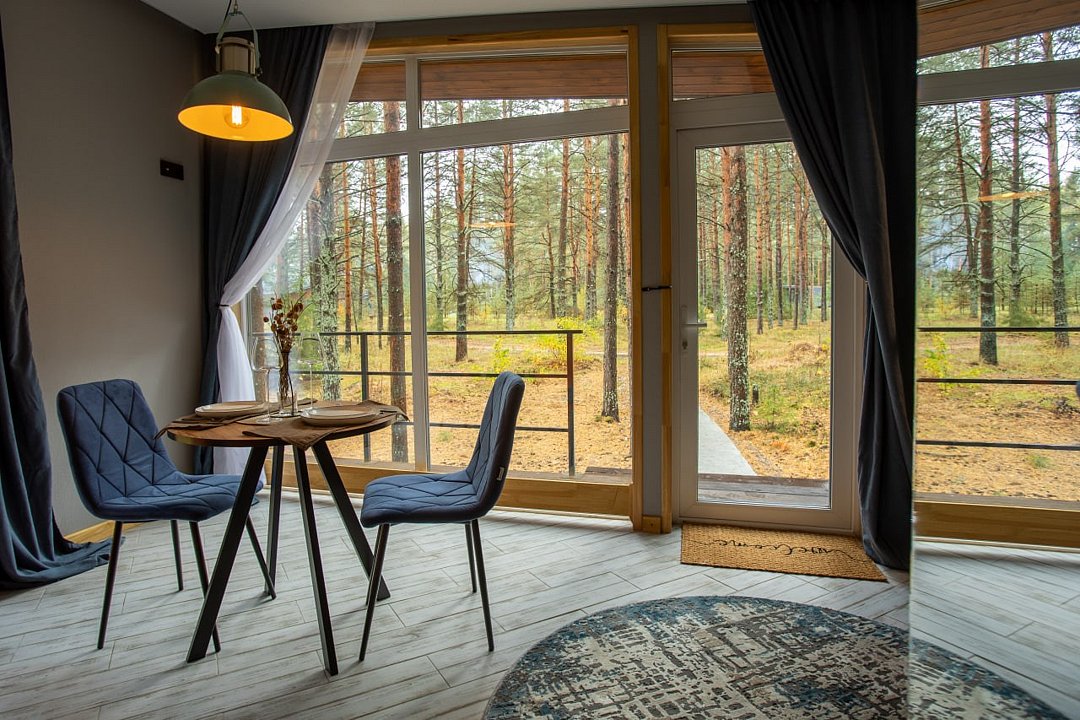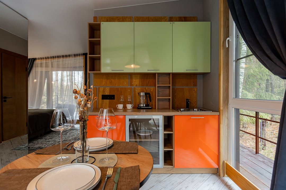 Гости размещаются в элегантных домиках-шале, выполненных в едином скандинавском стиле. Домик разделен большим зеркальным шкафом-купе на 2 зоны, спальня и гостиная с обеденной группой и раскладным диваном, что дает возможность организовать дополнительное место.