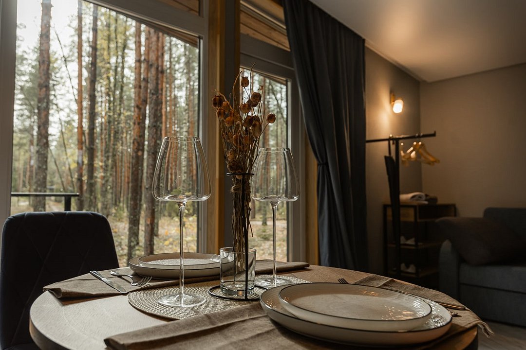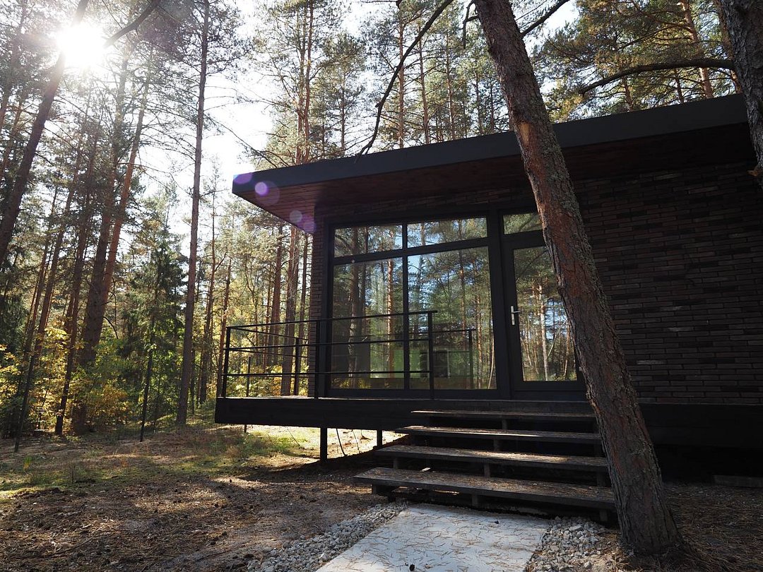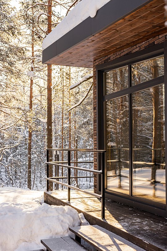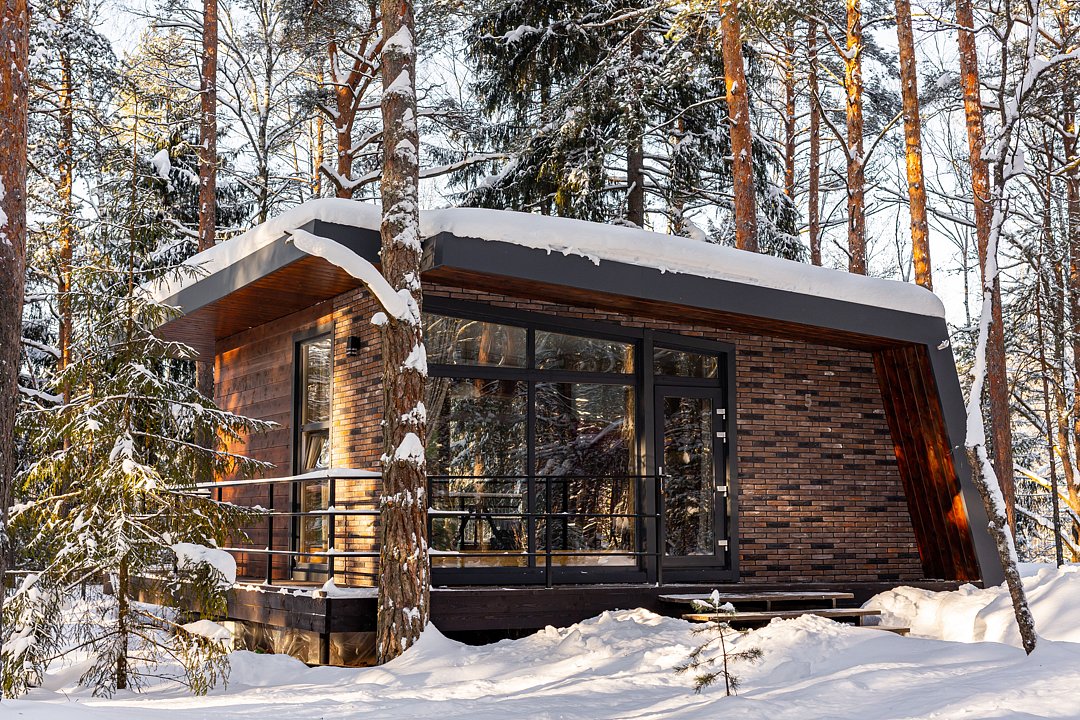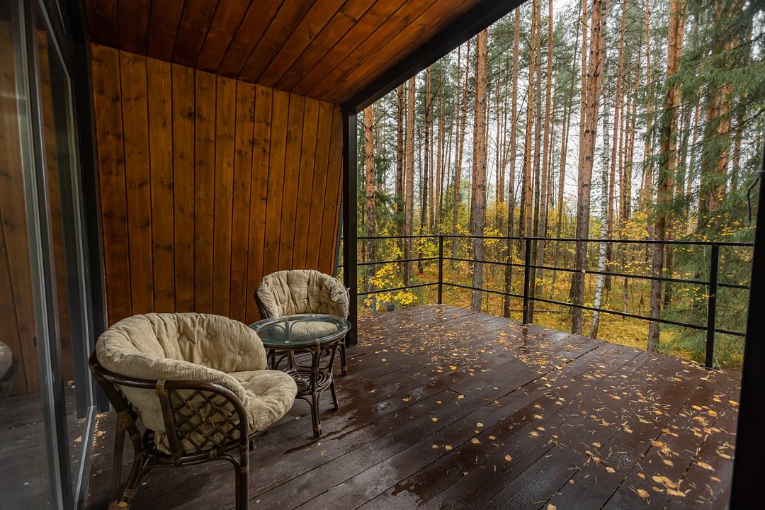 Домик-шале в сосновом лесу в стиле лофт с большой террасой и панорамными окнами на двоих с дополнительным местом, создан для уединения и отдыха на природе.