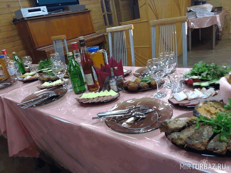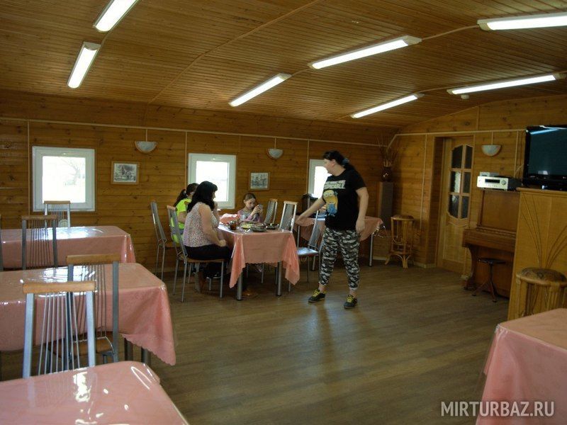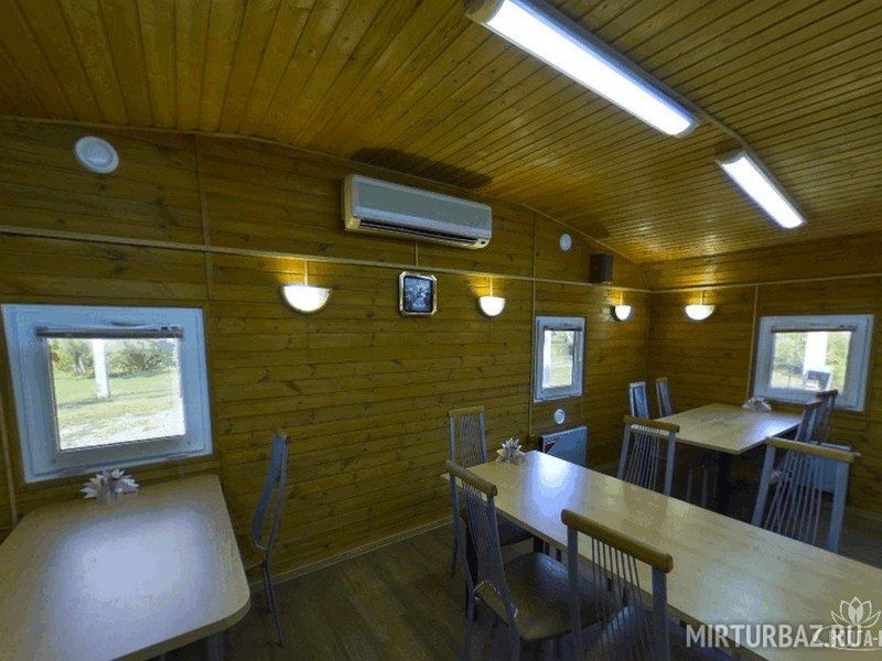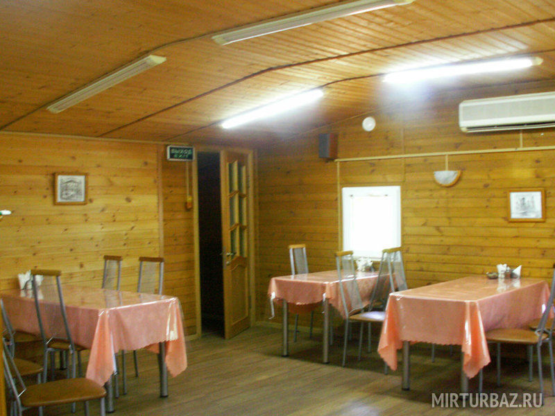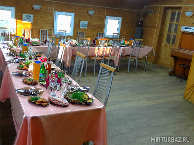 Столовая на базе отдыха работает каждый день. По желанию гостя шеф-повар приготовит любое изысканное блюдо, а для рыбалки — сухой паек в дорогу. База предлагает в столовой трехразовое или двухразовое питание, а также чайный стол, доступный в течение всего дня.