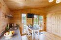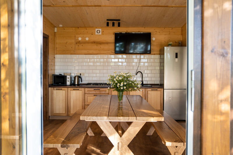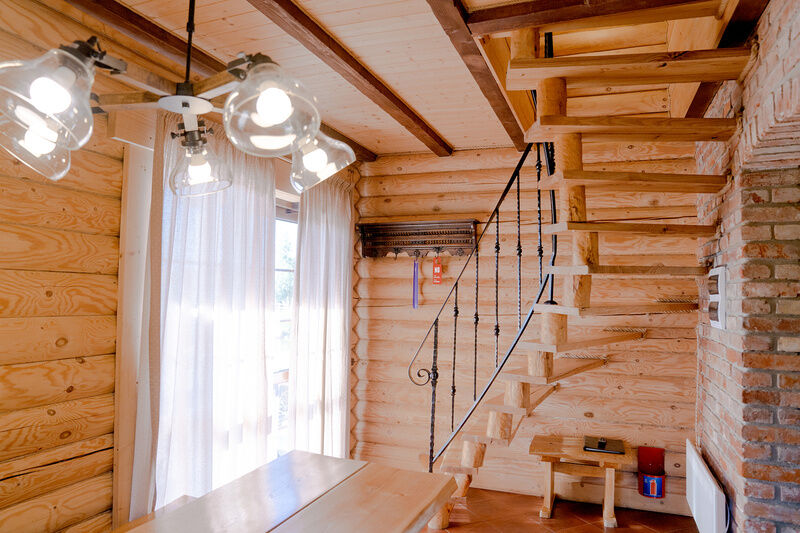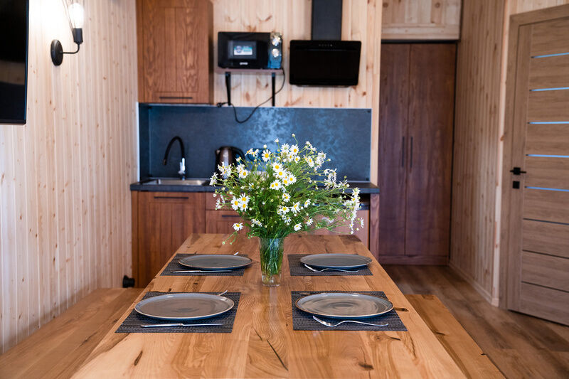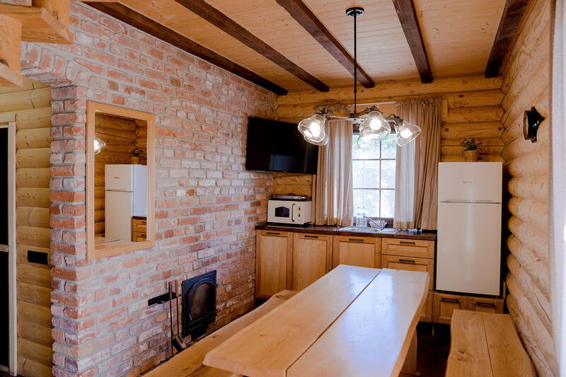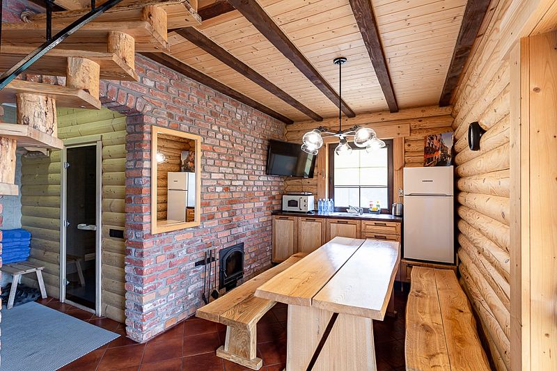 Для удобства гостей коттедж оснащен холодильником, телевизором, бесплатным Wi-Fi, чайником, плитой и набором посуды. Интерьер выполнен из дерева и соответствующе декорирован, что создает удивительно комфортную и тёплую атмосферу.