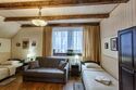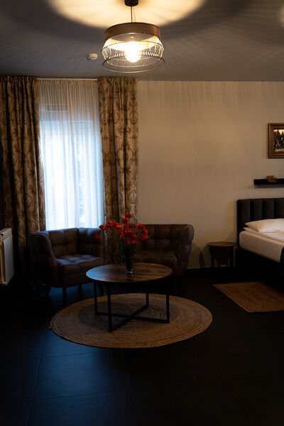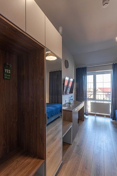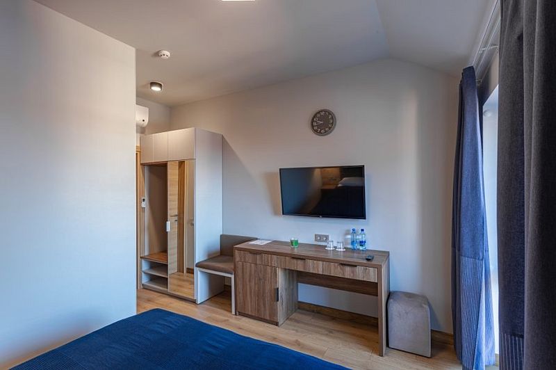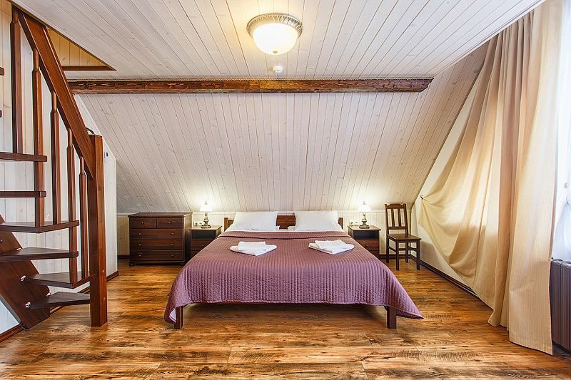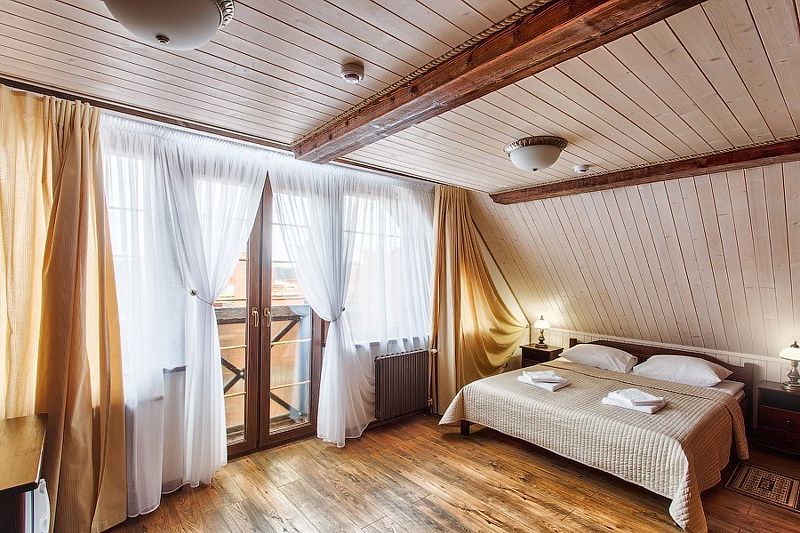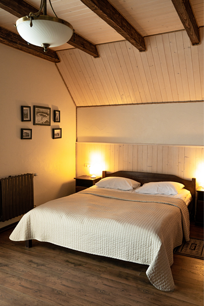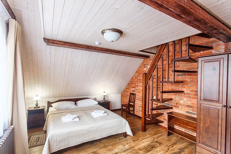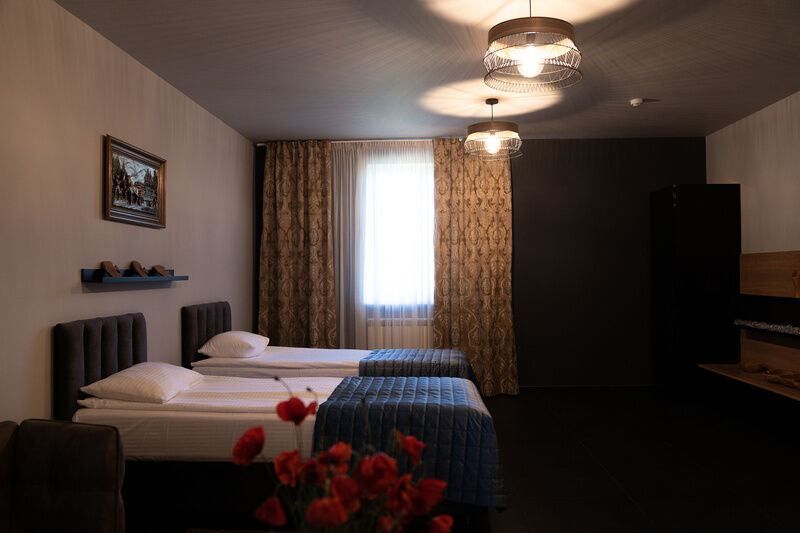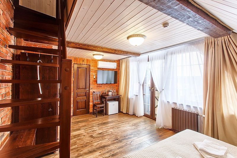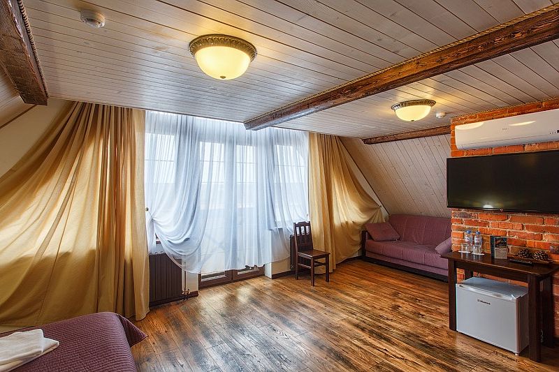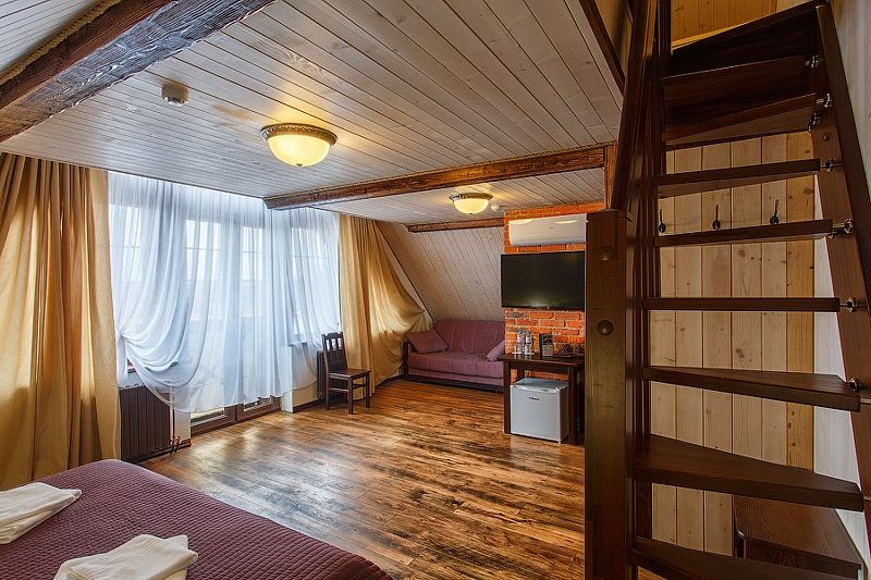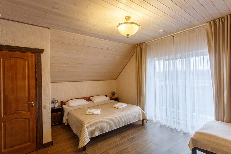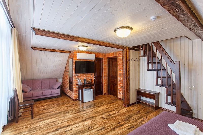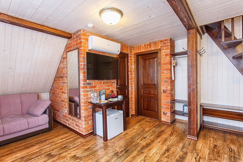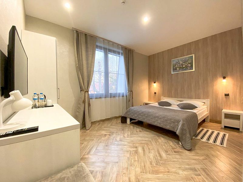 Здесь есть все необходимое для комфортного времяпровождения. В номере двуспальная кровать, собственным санузлом. Также имеется раскладной двуспальный диван, есть возможность бронирования с дополнительными спальными местами. Из окон открывается вид на территорию отеля. Отдельный вход. Номер данной категории находится в корпусе «Гильге».