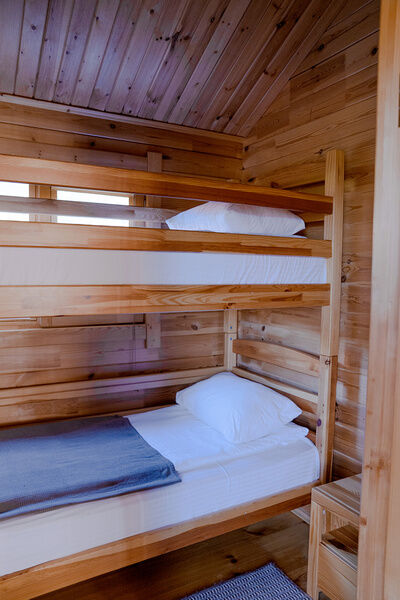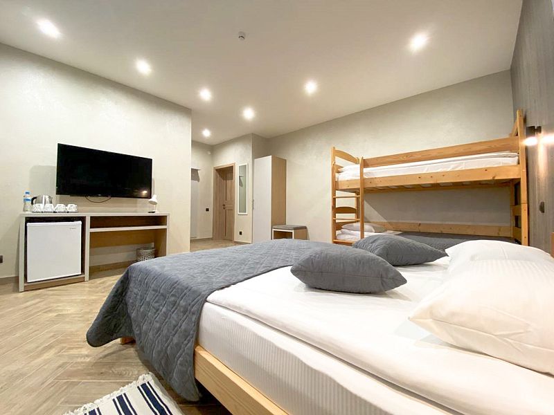 Здесь есть все необходимое для комфортного времяпровождения. В номере двуспальная кровать и двухъярусная кровать, собственный санузел. Из окон открывается вид на территорию отеля. Также имеется своя терраса и отдельный вход. Номера данной категории находятся в корпусе «Гильге».