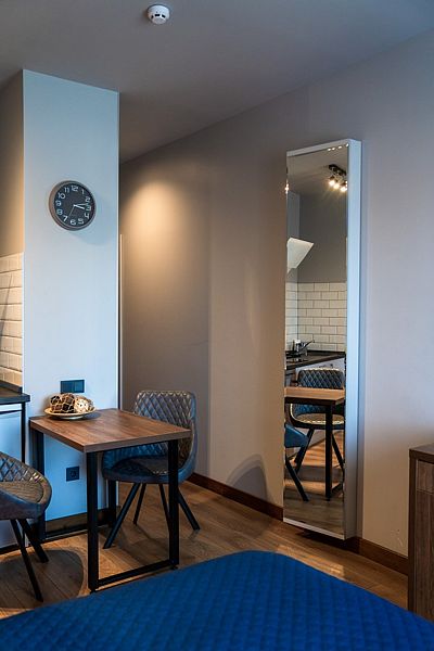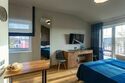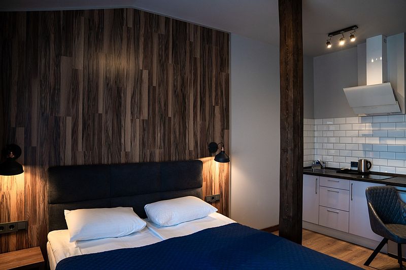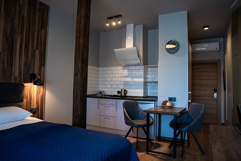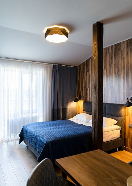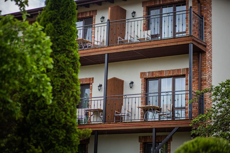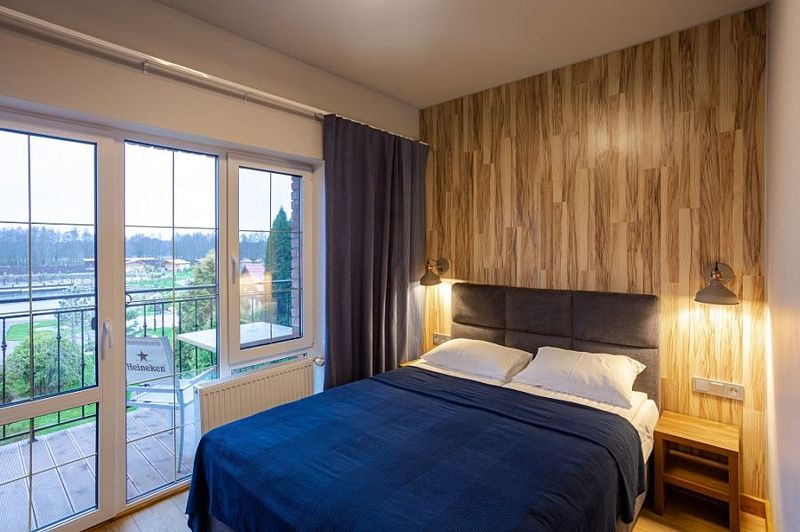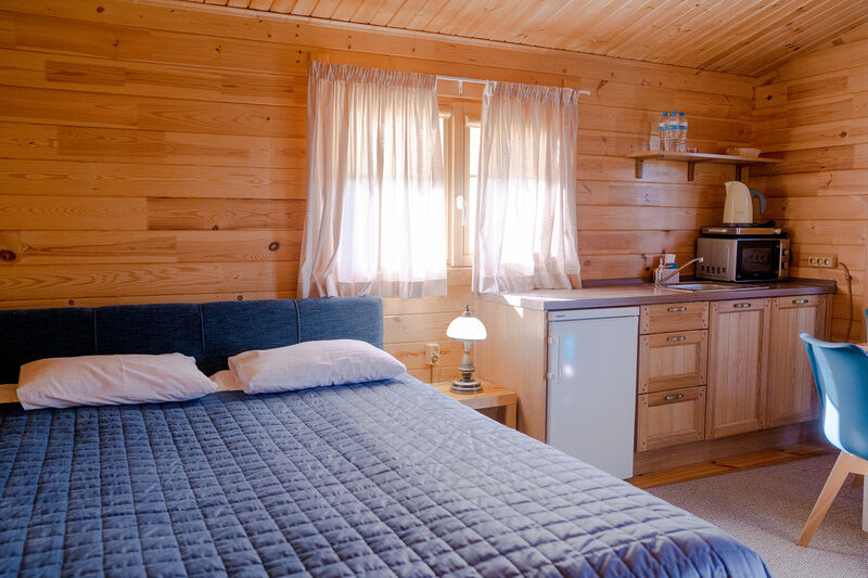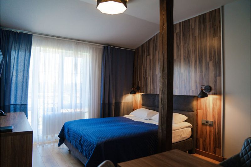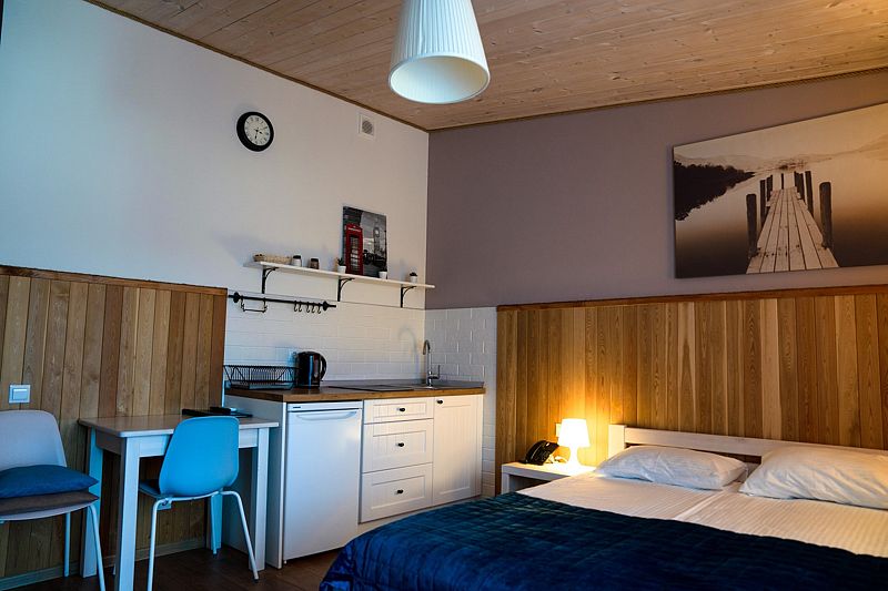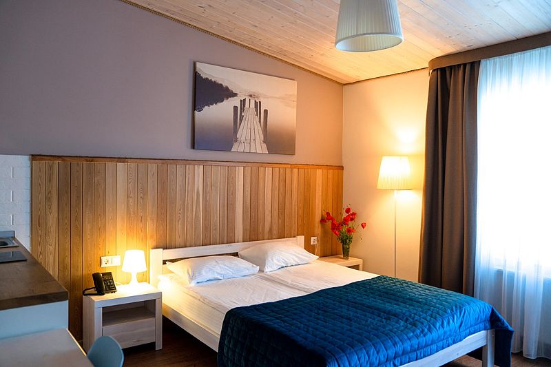 Номер оснащен двуспальной кроватью и кухонной зоной, также имеется балкон. Из номера открывается прекрасный вид на живописную территорию отеля. Номера данной категории находятся в корпусах «Немонин» или «Дейма».