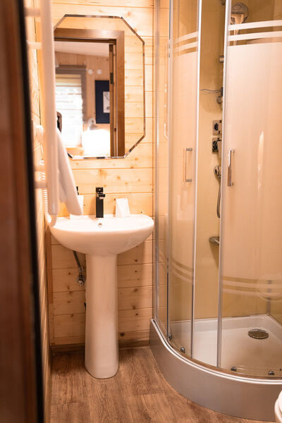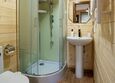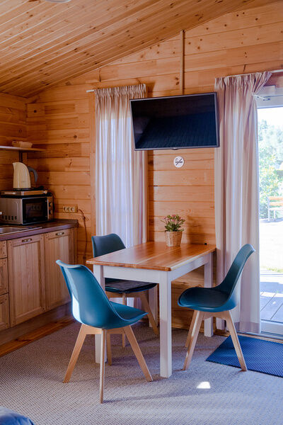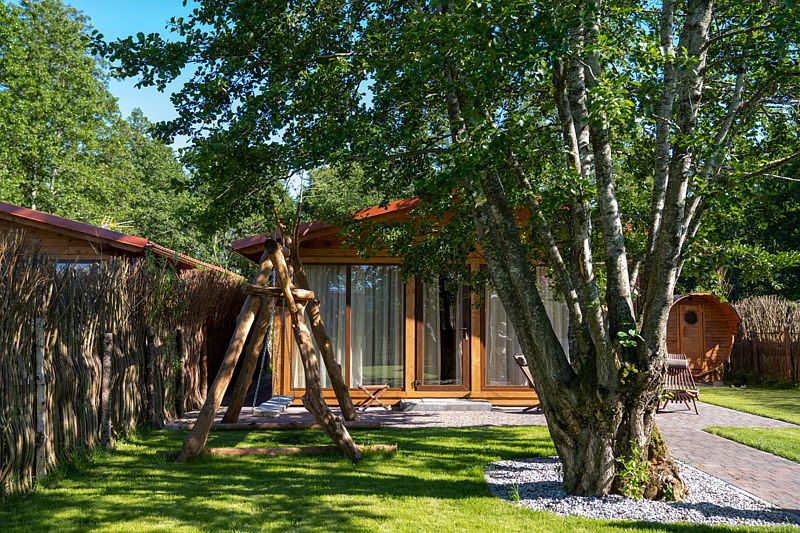 Коттедж с собственной кухней и обеденной зоной на отдельной приватной территории. В шале имеется две спальни, одна с двуспальной кроватью и одна с двумя односпальными кроватями. На территории у коттеджа есть беседка с мангалом, а также собственная баня.