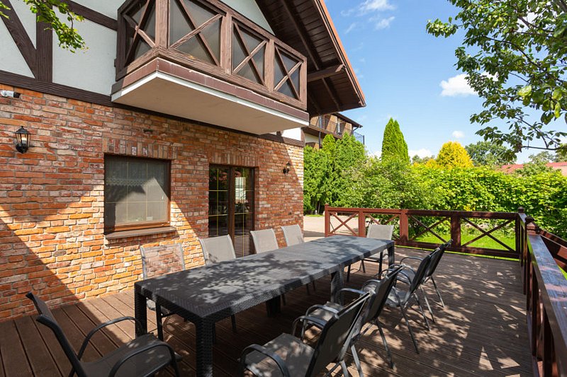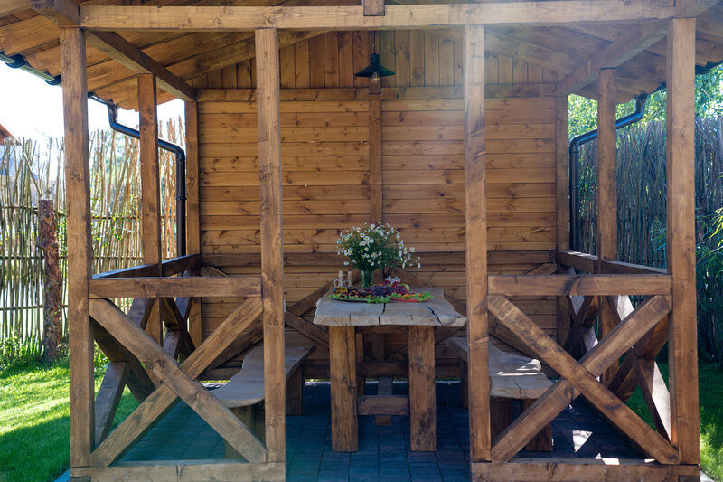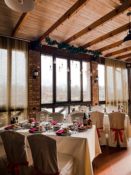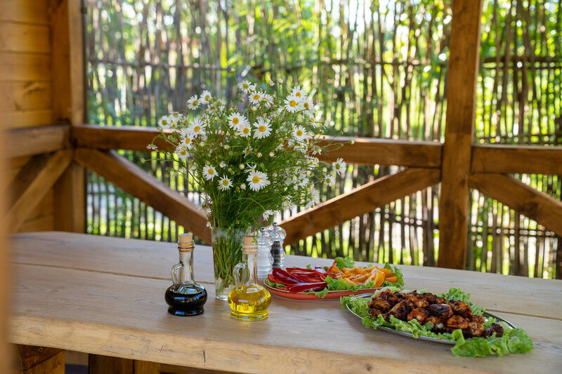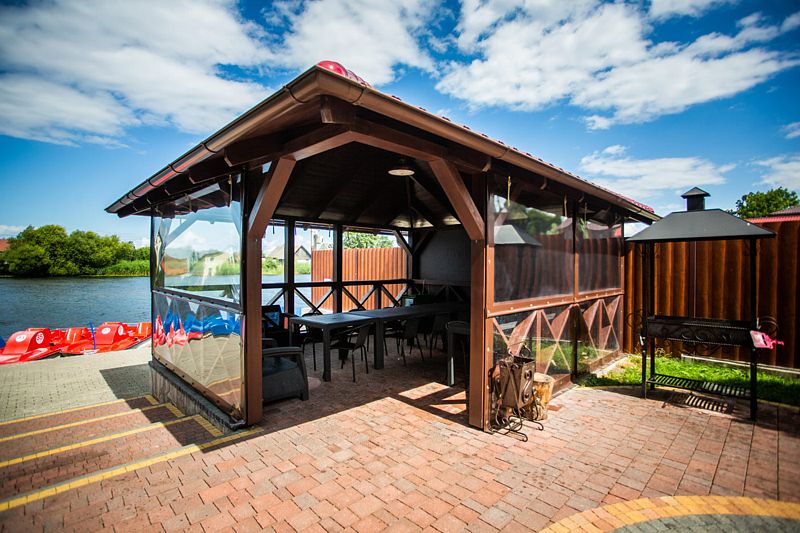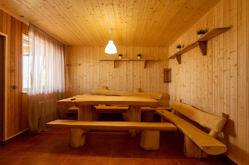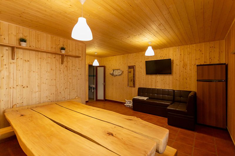 Читать полностьюВнутри располагается просторный зал, оснащенный большим дубовым столом, за которым с комфортом могут разместиться компании из 8-10 человек. Открыв двери на террасу, вы сможете насладиться живописным видом на реку, что добавит особый шарм вашему отдыху.