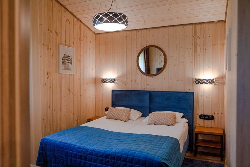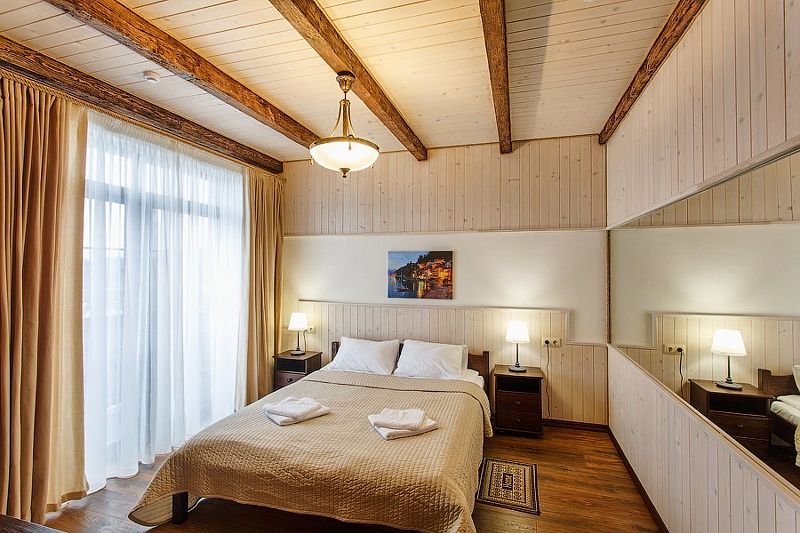 Номер оснащен двуспальной кроватью и собственным санузлом. Из окон открывается прекрасный вид на живописную территорию отеля или реку. Номера данной категории находятся в корпусах «Тимбер» или «Дейма».
