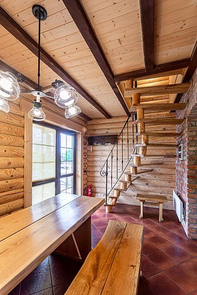Первый этаж коттеджа включает в себя практичную кухонную зону и обеденную зону. Здесь также располагается русская баня на дровах. Санузел находится на первом этаже.