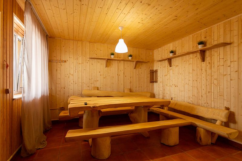 В стоимость проживания включен 3-часовой сеанс в бане на дровах, расположенной на первом этаже коттеджа.
