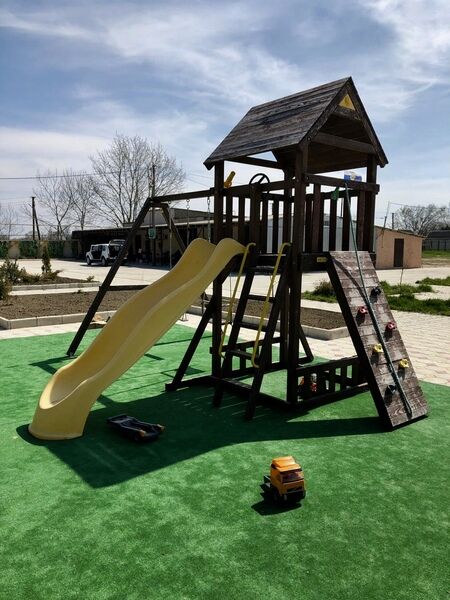 Для отдыхающих с детьми предлагается очень интересная детская игровая площадка с качелями, турниками и батутом.