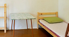2 односпальные кровати, доп.место: раскладушка/ кровать, стеллаж для одежды, стол, чайник. С/у, душ на территории.
