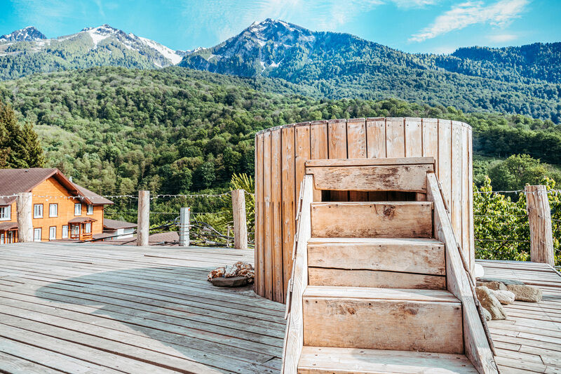 Потрясающая горячая бочка с видом на горы. Идеальная возможность получить физическое и эстетическое удовольствие одновременно.