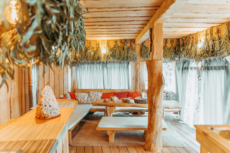 Двухэтажный банный комплекс в деревянном строении в уютном альпийском стиле с элементами «хоббитской» избушки. Просторная русская парная, ведра для обливания, горячая купель на крыше-терассе и большой проточный бассейн с холодной водой – все это к услугам наших гостей.