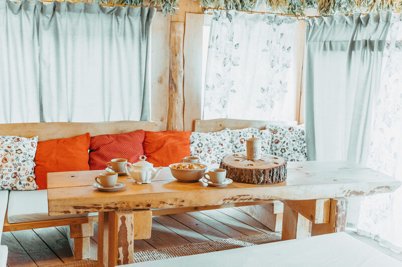 В общей комнате, она же комната отдыха-диванчики с подушками, деревянный стол с угощениями и чаем. Чай, соленые палочки и три вида варенья входят в стоимость. Там же стойка-кухонька, можно помыть руки, взять кое-какую посуду.