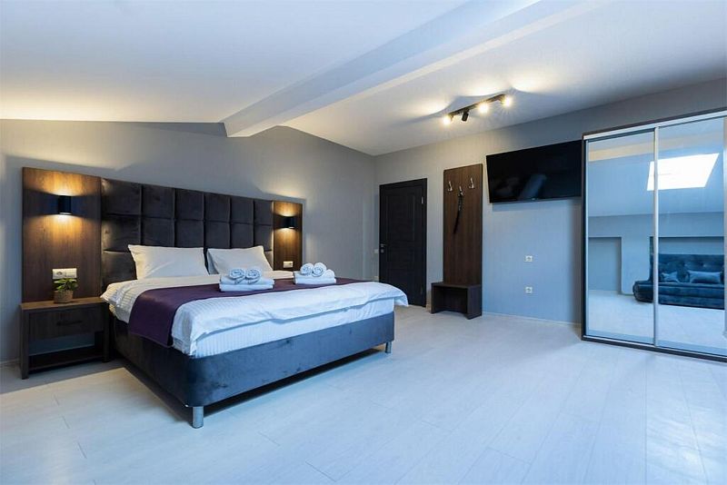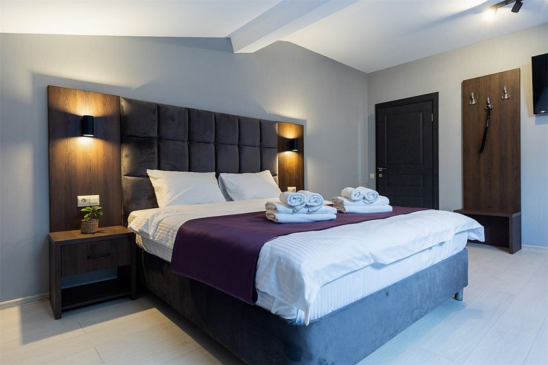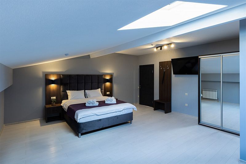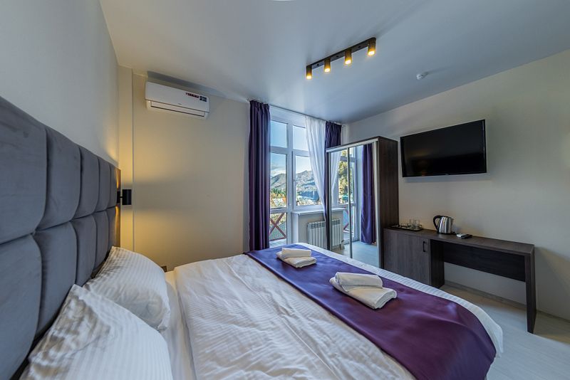Панорамный люкс с двуспальной кроватью «king-size» с постельным бельем премиум качества. Панорамные окна с частичным видом на горы.