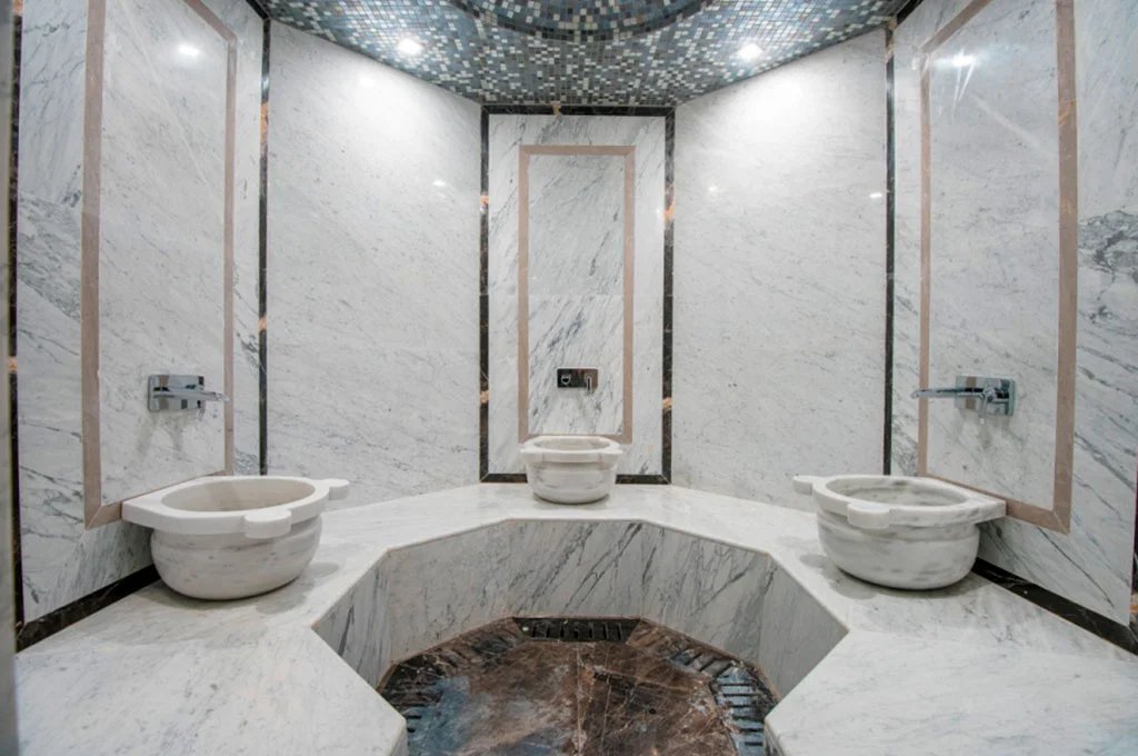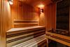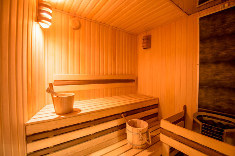 Отделка сауны выполнена из натурального дерева, отдыхающим предоставляются все необходимые аксессуары для парения: простыни, шапочки.