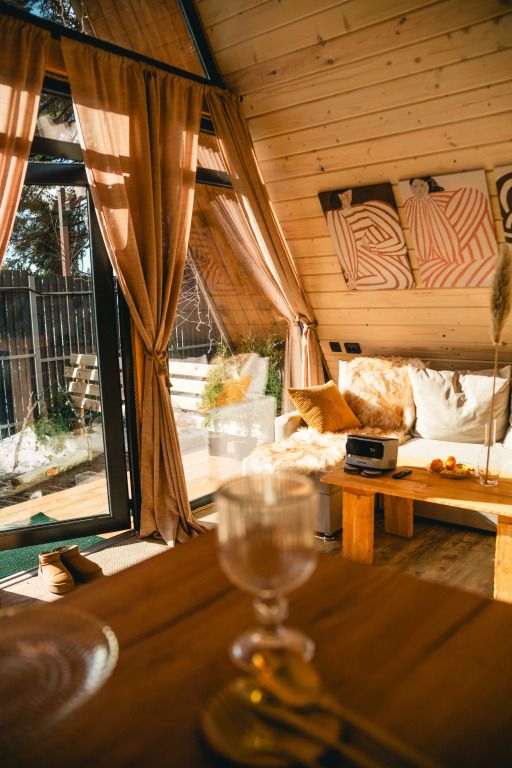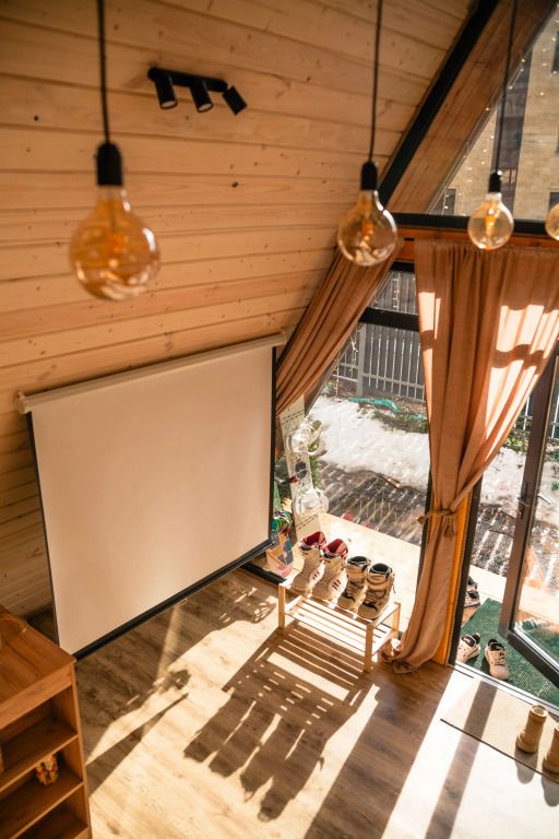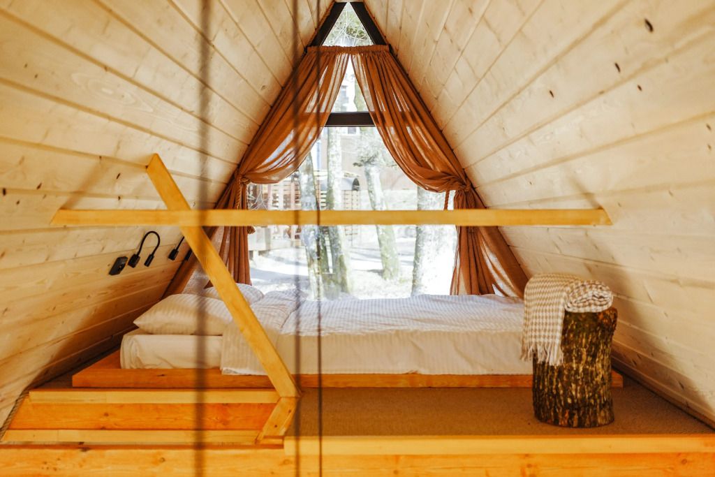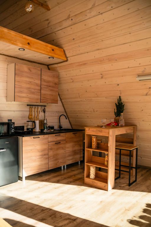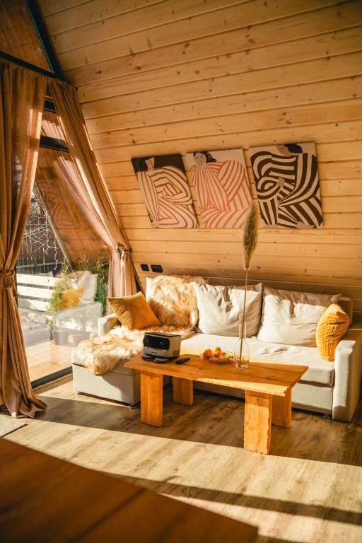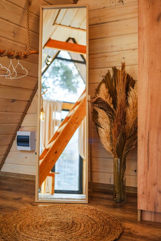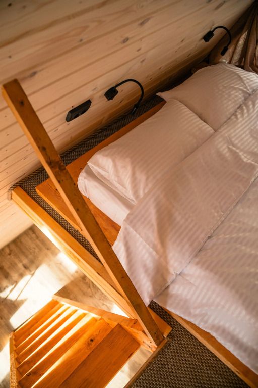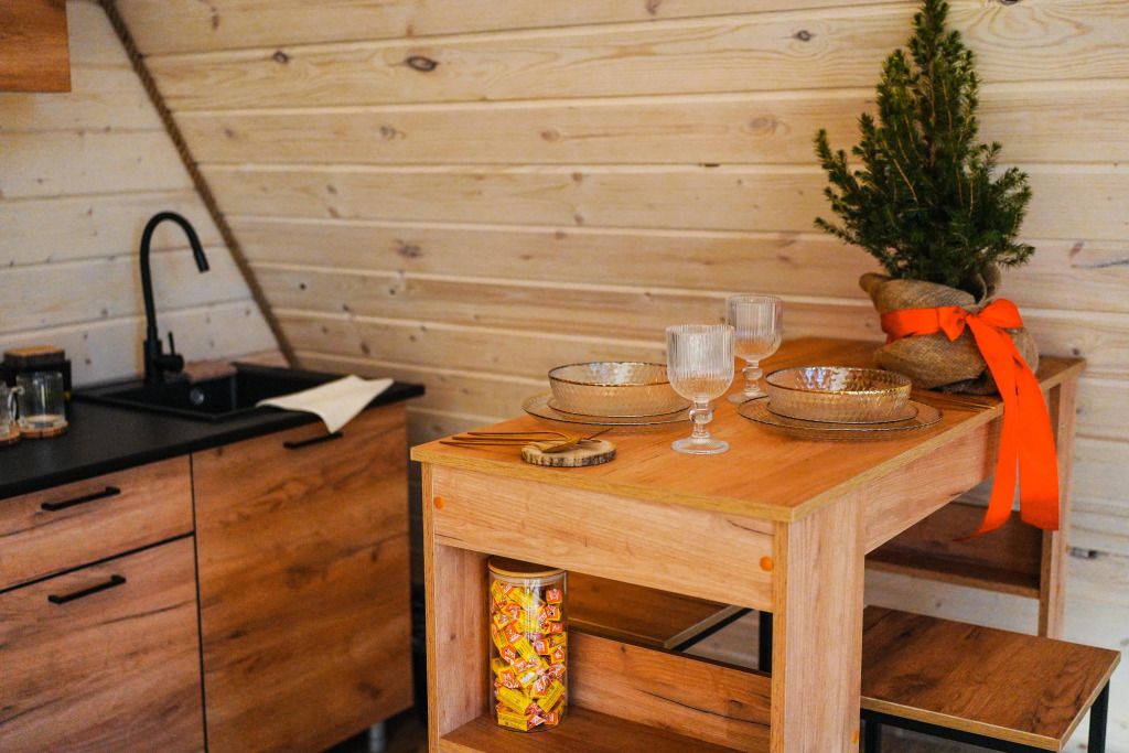 К услугам гостей коттедж площадью 36 кв. м с панорамными окнами и с эко-дизайном, выполненном с использованием натуральных материалов. Имеется гостиная-трансформер, в которой гости найдут лаунж с видами на горы и кинозал с проектором. Кухня оснащена посудой, необходимой для приготовления пищи. Также к услугам гостей ванная с relax эффектом и фирменная соль для ванн с хвоей. Спальня расположена на мансарде, спальное место располагается под деревянными балками.