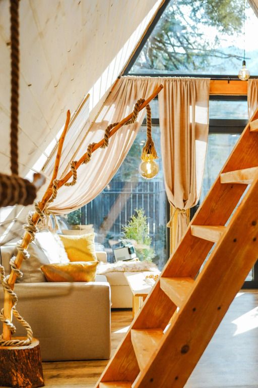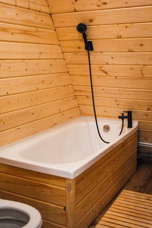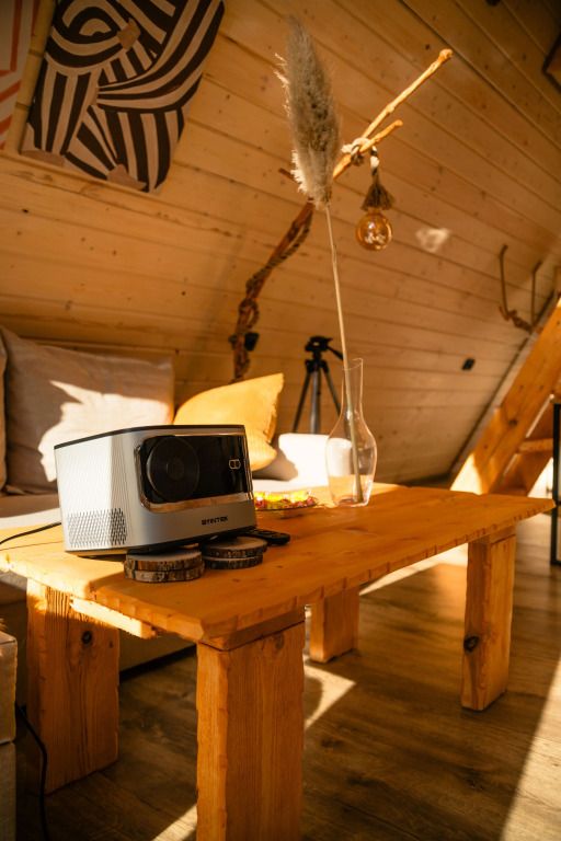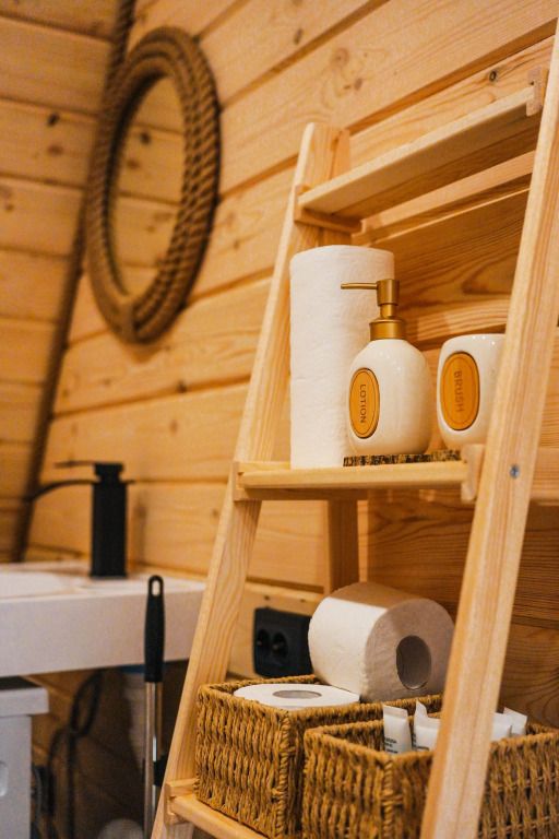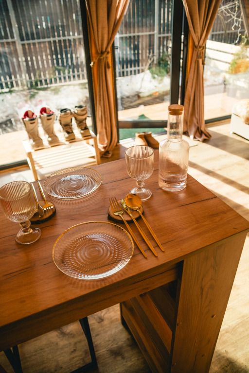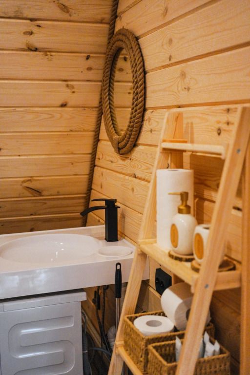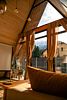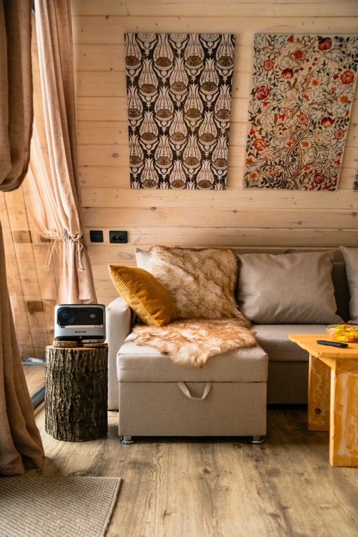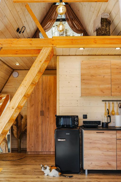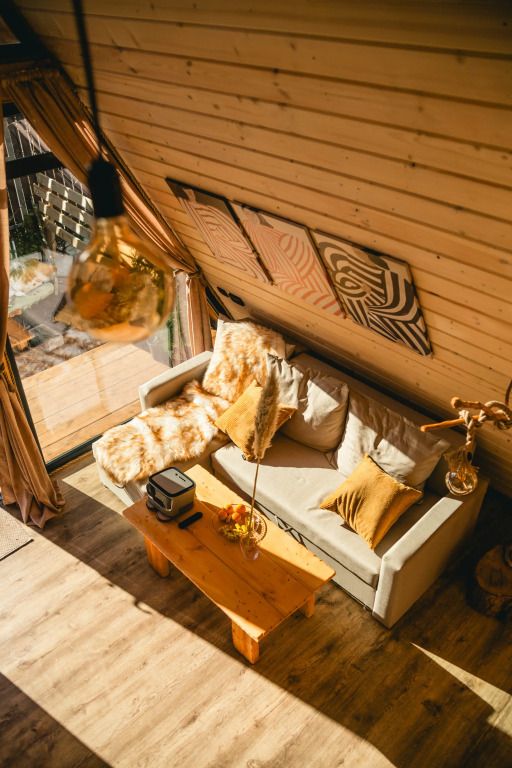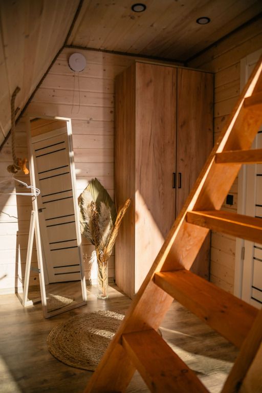 К услугам гостей коттедж площадью 36 кв. м с панорамными окнами и с эко-дизайном, выполненном с использованием натуральных материалов. Имеется гостиная-трансформер, в которой гости найдут лаунж с видами на горы и кинозал с проектором. Кухня оснащена посудой, необходимой для приготовления пищи. Также к услугам гостей ванная с relax эффектом и фирменная соль для ванн с хвоей. Спальня расположена на мансарде, спальное место располагается под деревянными балками.