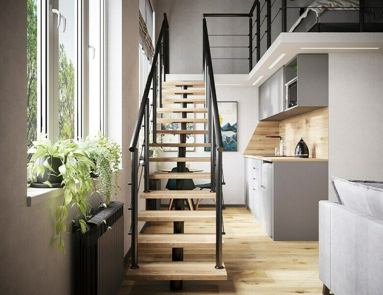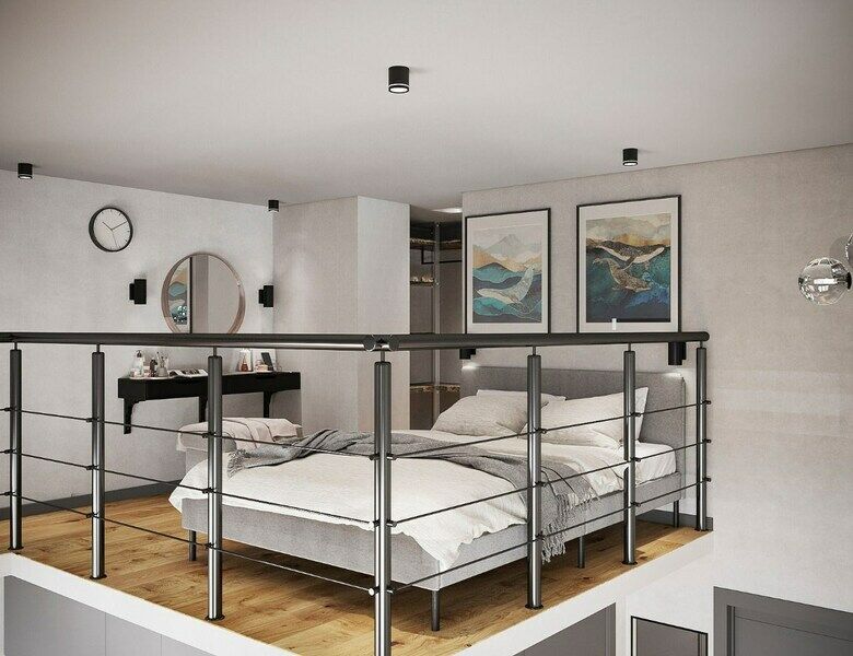 Просторные двухуровневые апартаменты с большой двуспальной кроватью, двухместным раскладным диваном и кухней.
