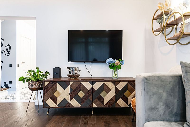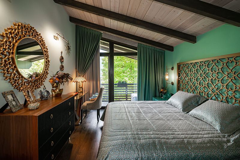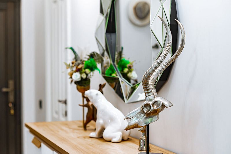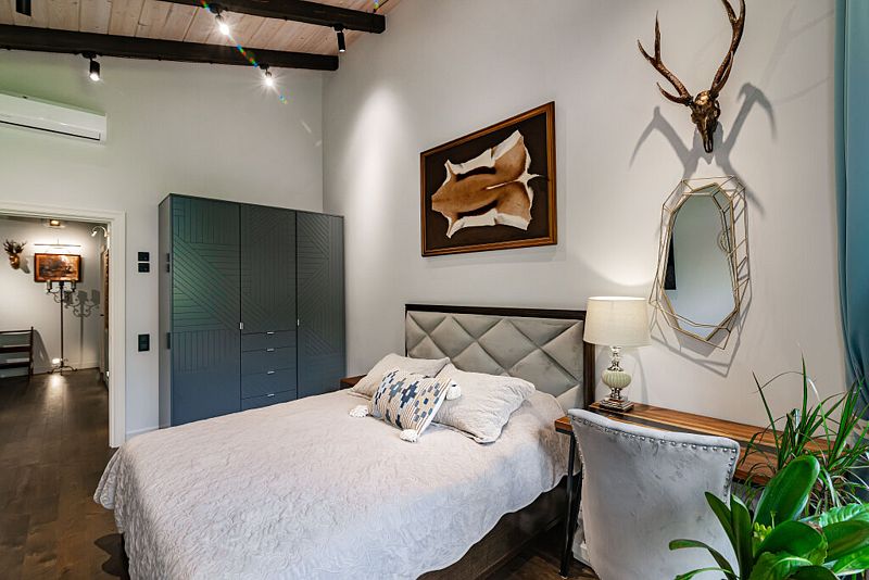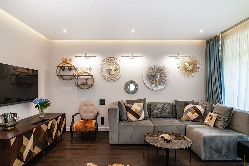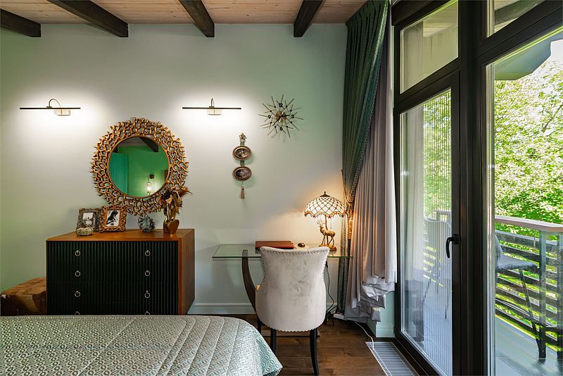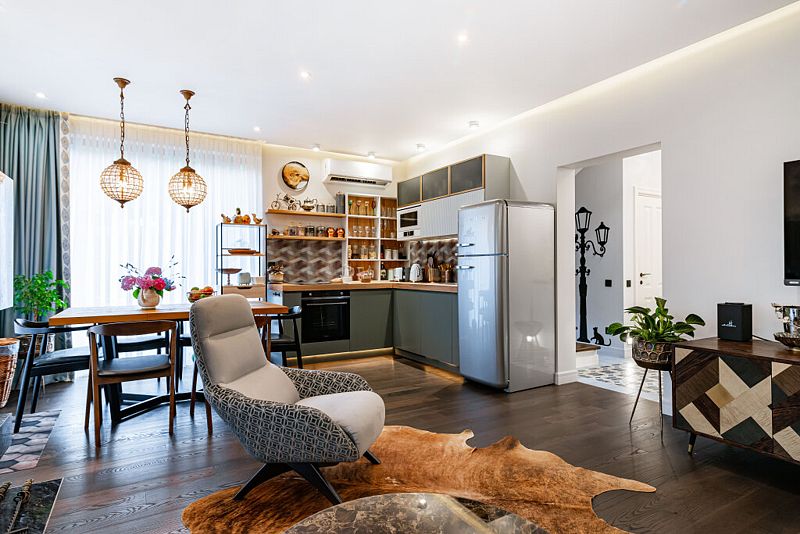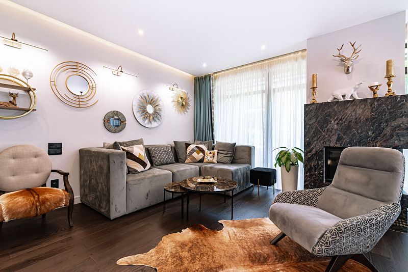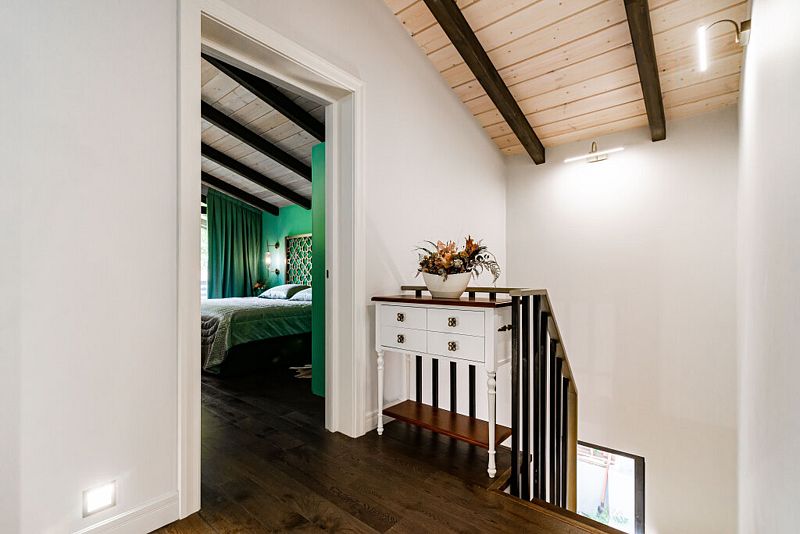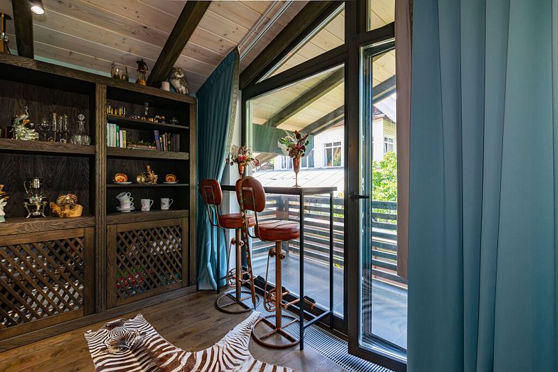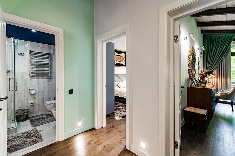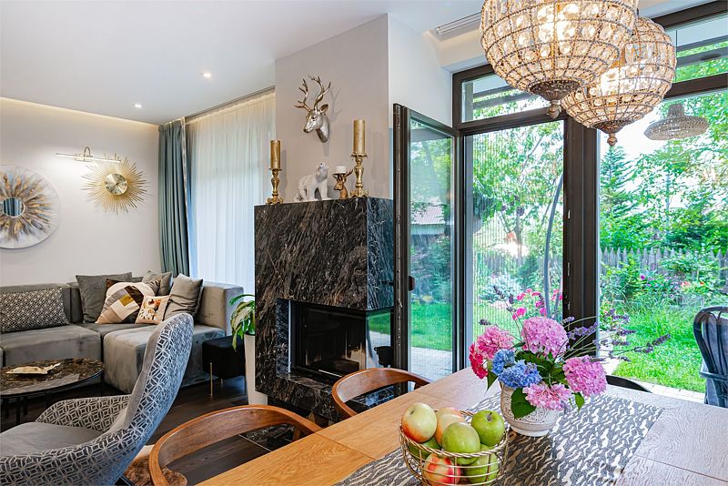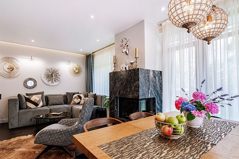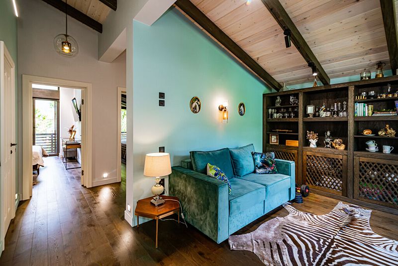 Первый этаж дома порадует вас просторной гостиной с полностью оборудованной кухней, оснащенной премиальной техникой. Дровяной камин согреет вас холодными вечерами, а удобный диван станет идеальным местом для дружеских посиделок с бокалом любимого напитка. В доме представлена разнообразная коллекция бокалов.