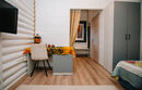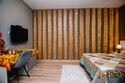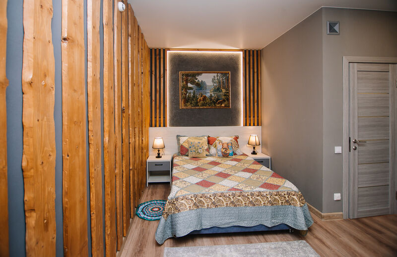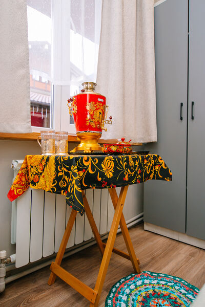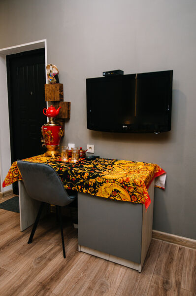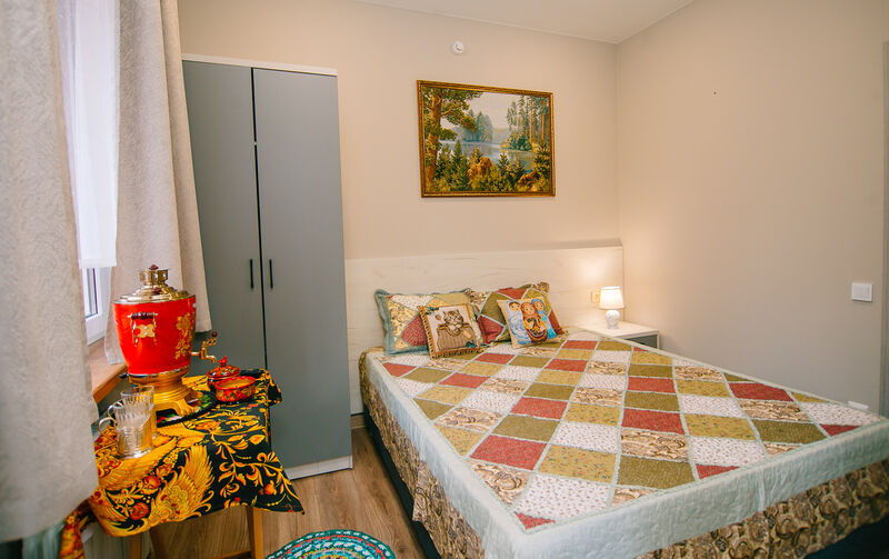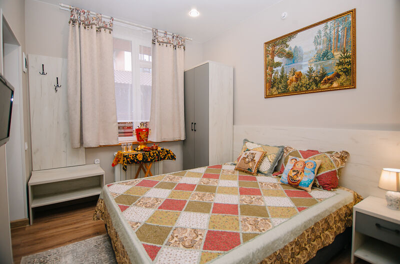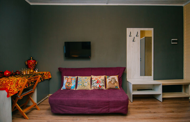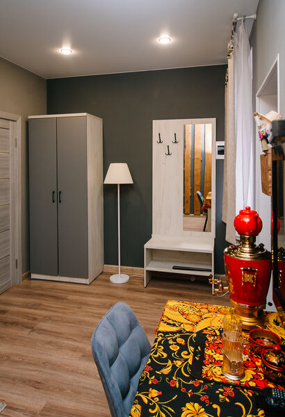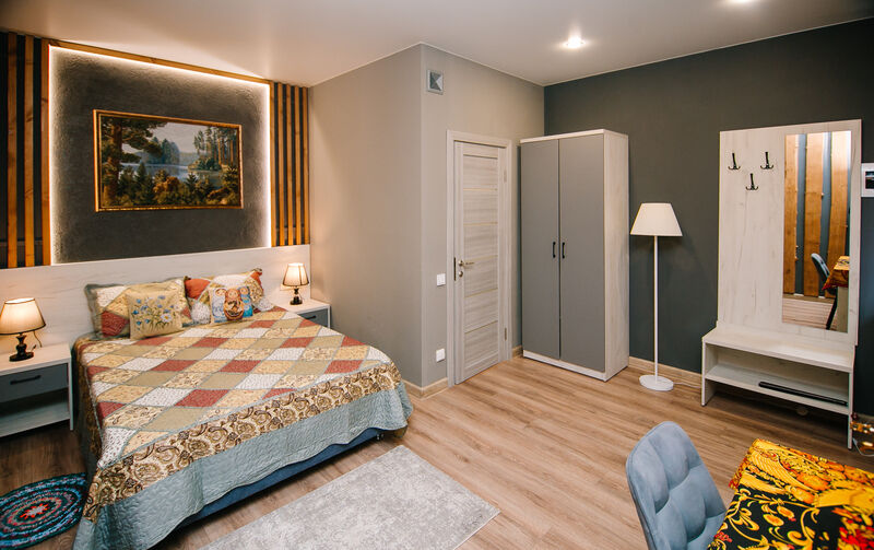 В стильном интерьере апартаментов присутствуют русские народные мотивы. Номера обустроены комфортабельной мягкой и корпусной мебелью, кондиционером, телевизором, холодильником м электрическим чайником. Среди удобств так же собственная ванная комната и Wi-Fi.