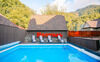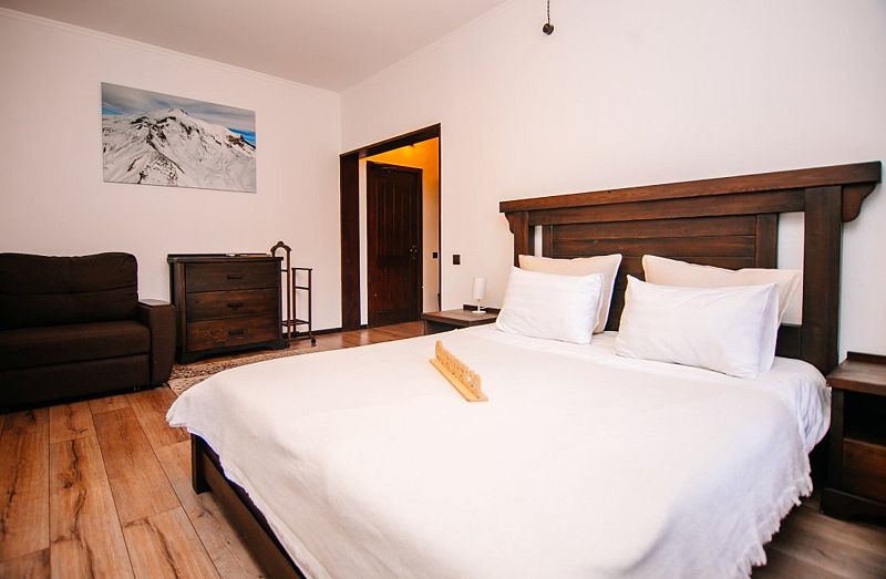 Двухуровневое бунгало, отдельно стоящее здание со своим входом. Кухня, обеденная зона, гостинная с диванами и спальня-антресоль с кроватью king-size, терраса с видом на горы, санузел с душем, большой телевизор, холодильник, фен, плита, микроволновая печь