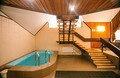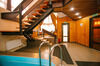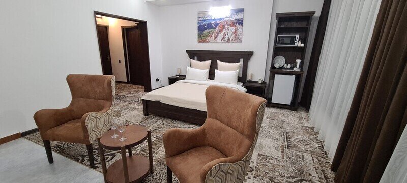 Номер с камином, гидромассажной ванной и видом на горы. В номере большой санузел с окном в номер, большая кровать размера king-size, телевизор, холодильник, микроволновая печь, чайник, посуда, фен