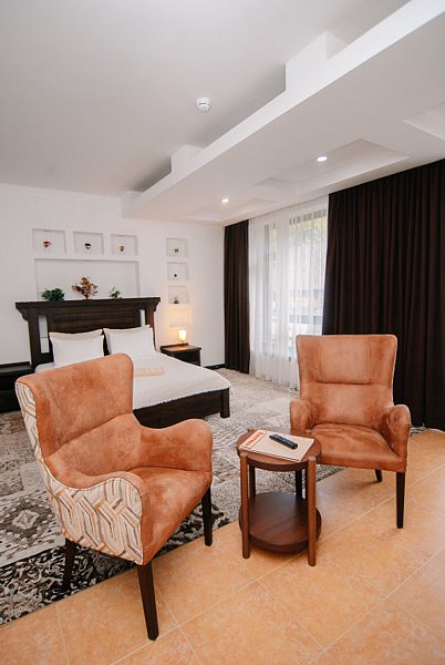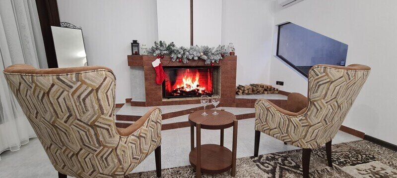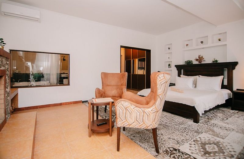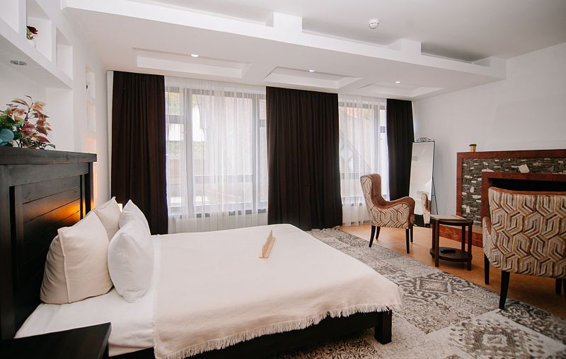 Люкс с камином, гидромассажной ванной и видом на горы.
