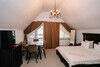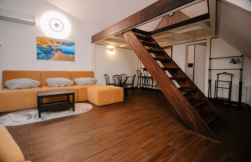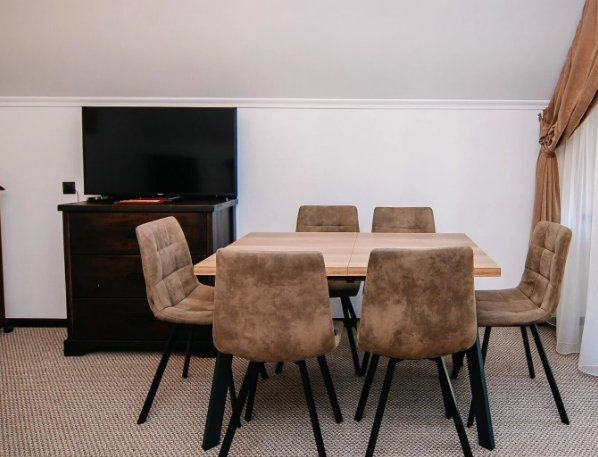 Апартаменты на мансардном этаже. Укомплектованная кухня, обеденная зона, 2 комнаты с кроватями king-size и одна комната с двухъярусной кроватью, 2 балкона с видом на горы, санузел с душем, 3 телевизора, холодильник, стиральная машина