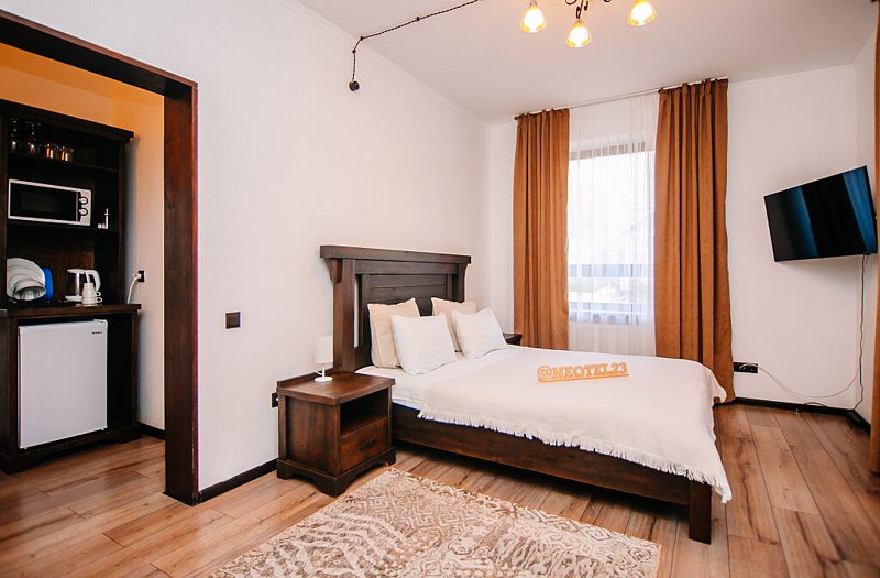 Две раздельные кровати или одна кровать king-size, санузел с душем, балкон с мебелью, телевизор, холодильник, микроволновая печь, чайник, посуда