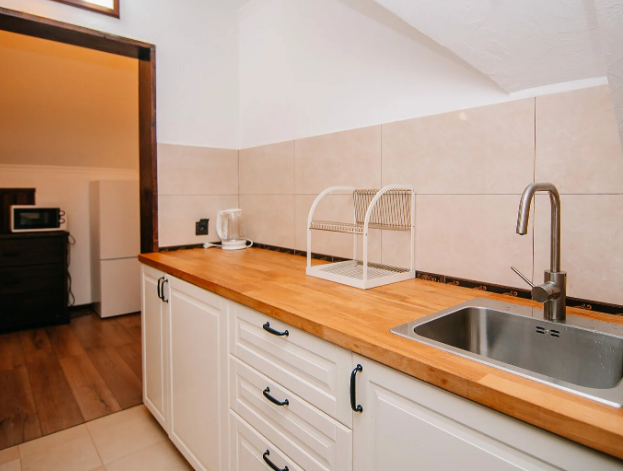 Двуспальная кровать, диваном-кровать, санузел с душем, телевизор, холодильник, микроволновая печь, чайник, посуда, кухня, обеденная зона