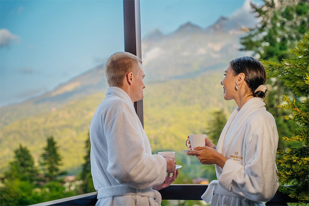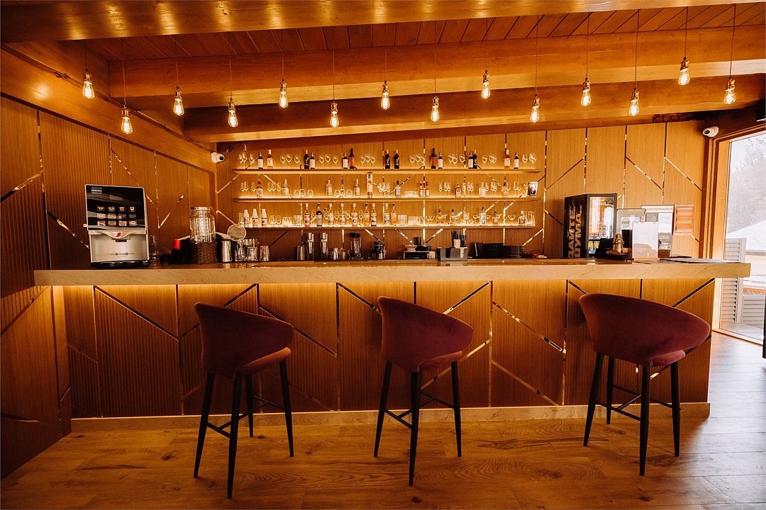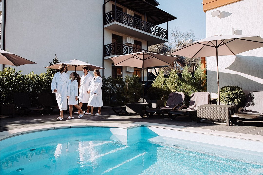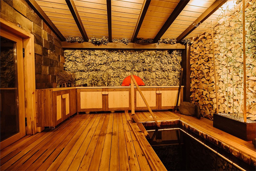 На территории отеля имеется открытый бассейн с подогревом, банный комплекс с парилкой, дровяной печью, купелью и услугами профессиональных банщиков. Также для гостей предусмотрены детская площадка на свежем воздухе, помещения для хранения и сушки лыжного снаряжения, а также открытая и подземная парковки для автомобилей.