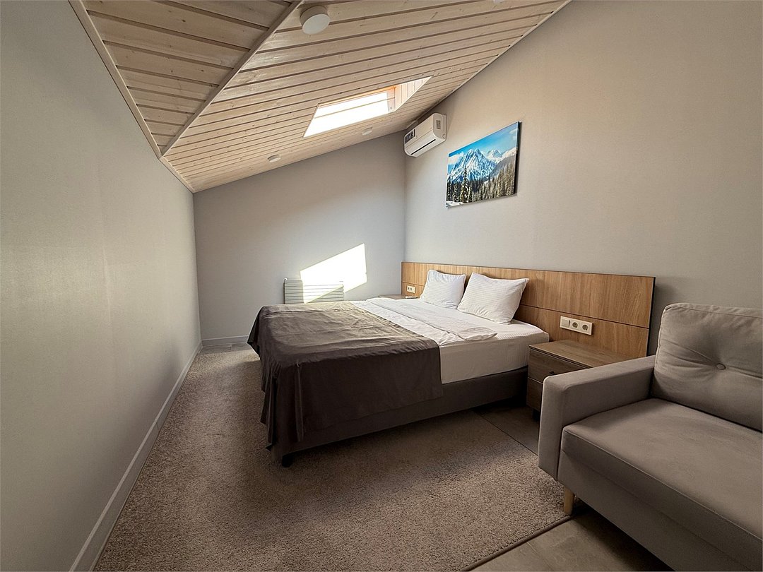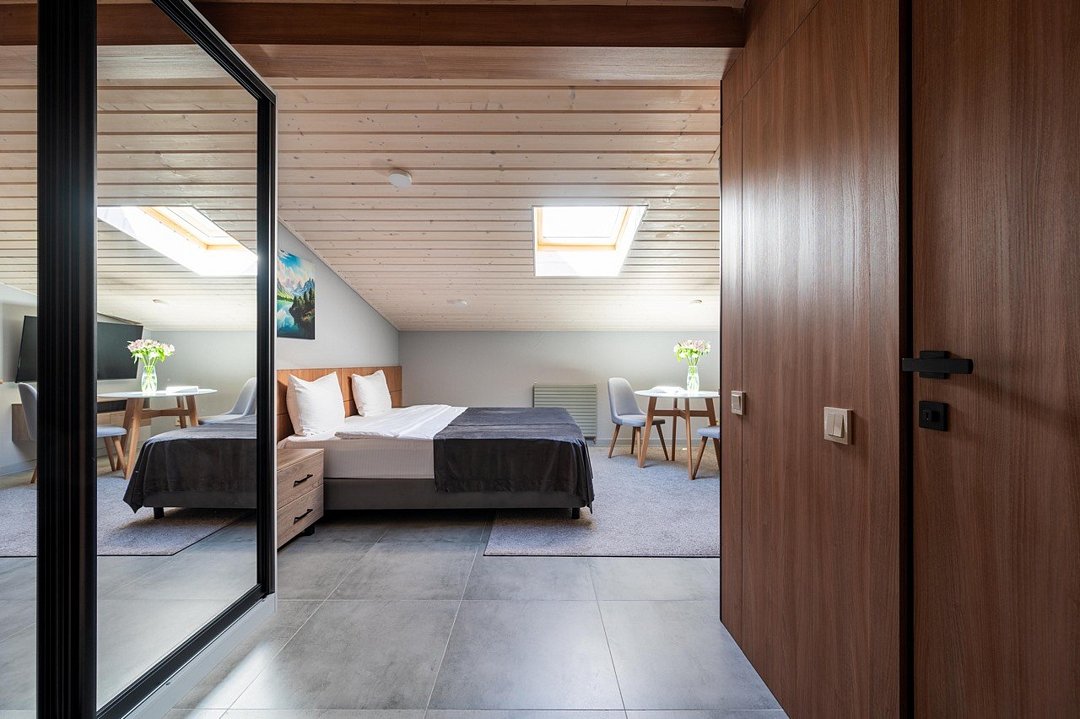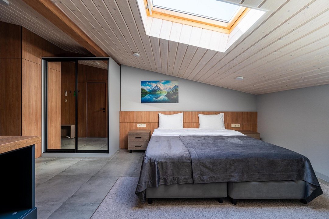 Просторный двухкомнатный номер с одной двуспальной кроватью или двумя односпальными, двухместным раскладным диваном, мини-кухней и мансардным окном с видом на звездное небо.